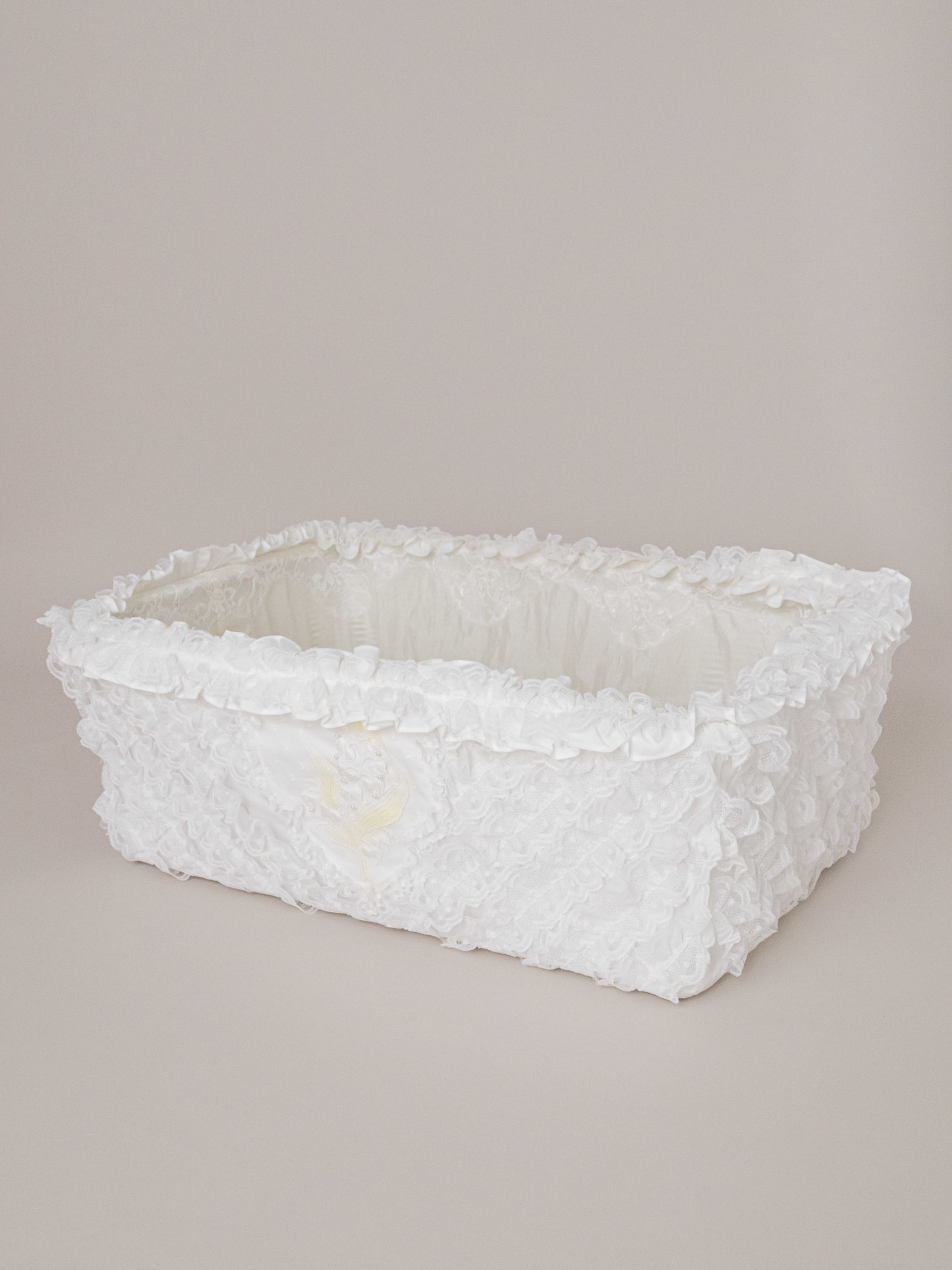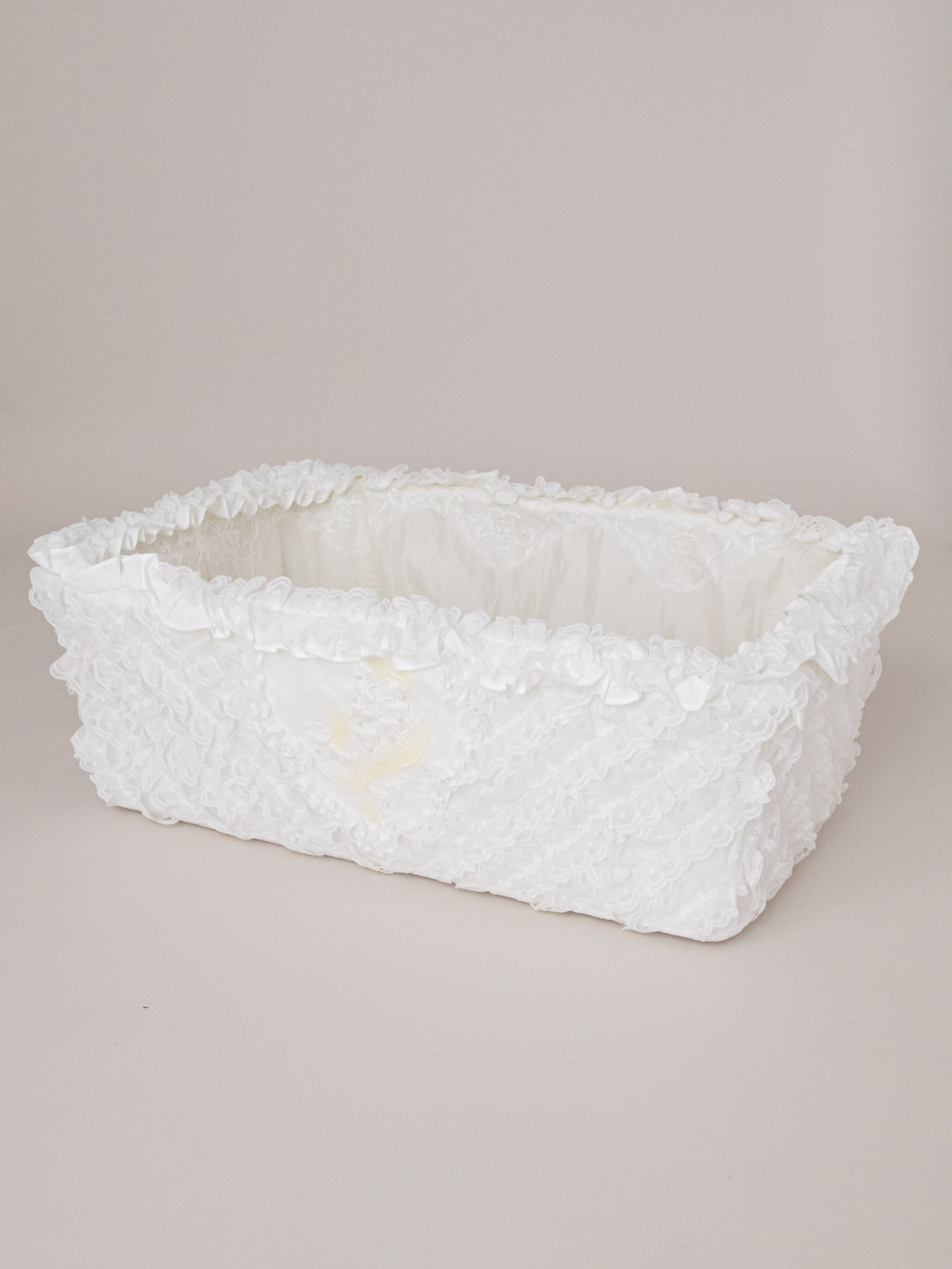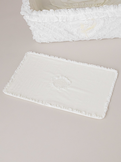 たっぷりのギャザーフリルで埋め尽くしタイプのバスケットです。