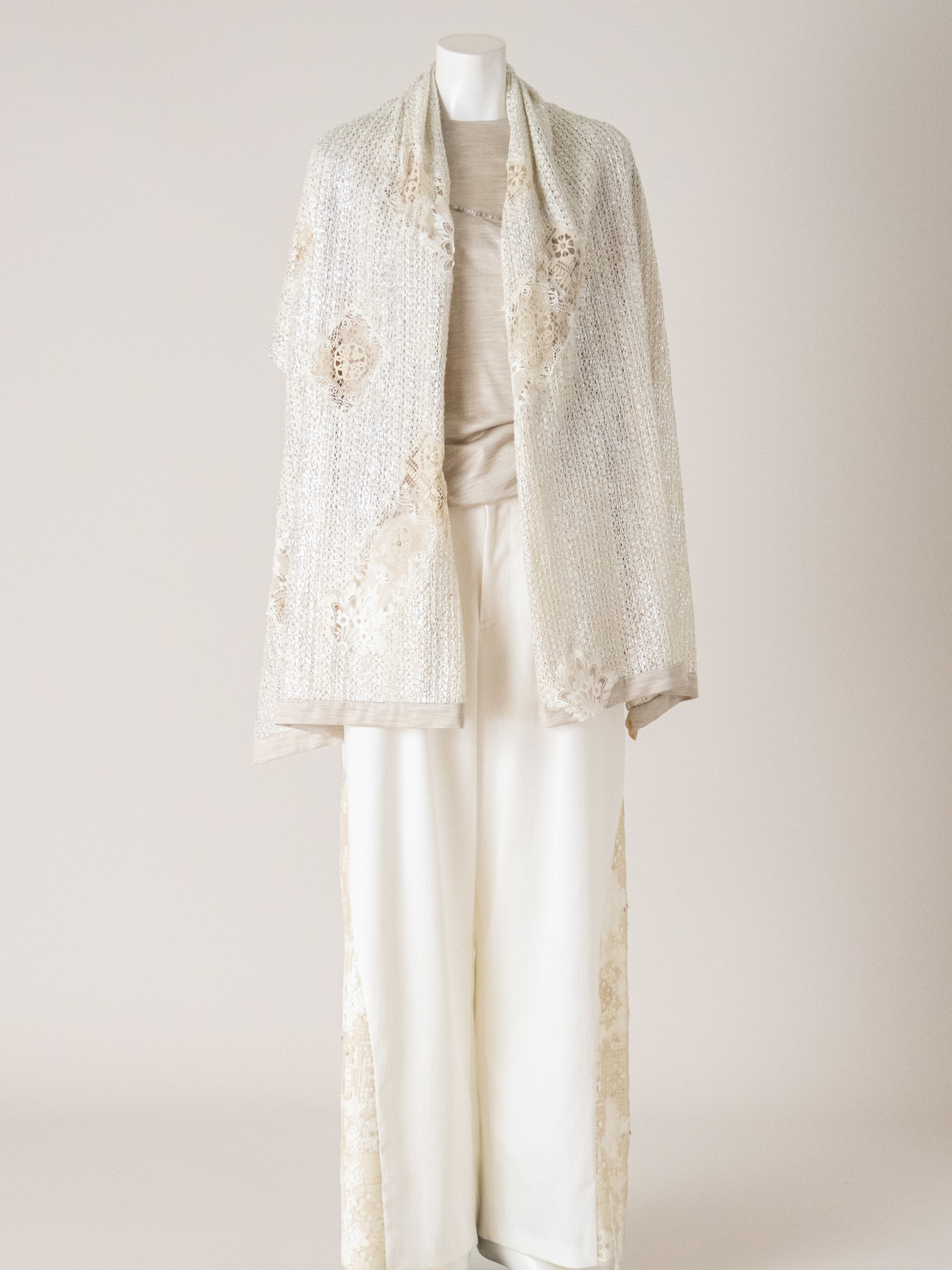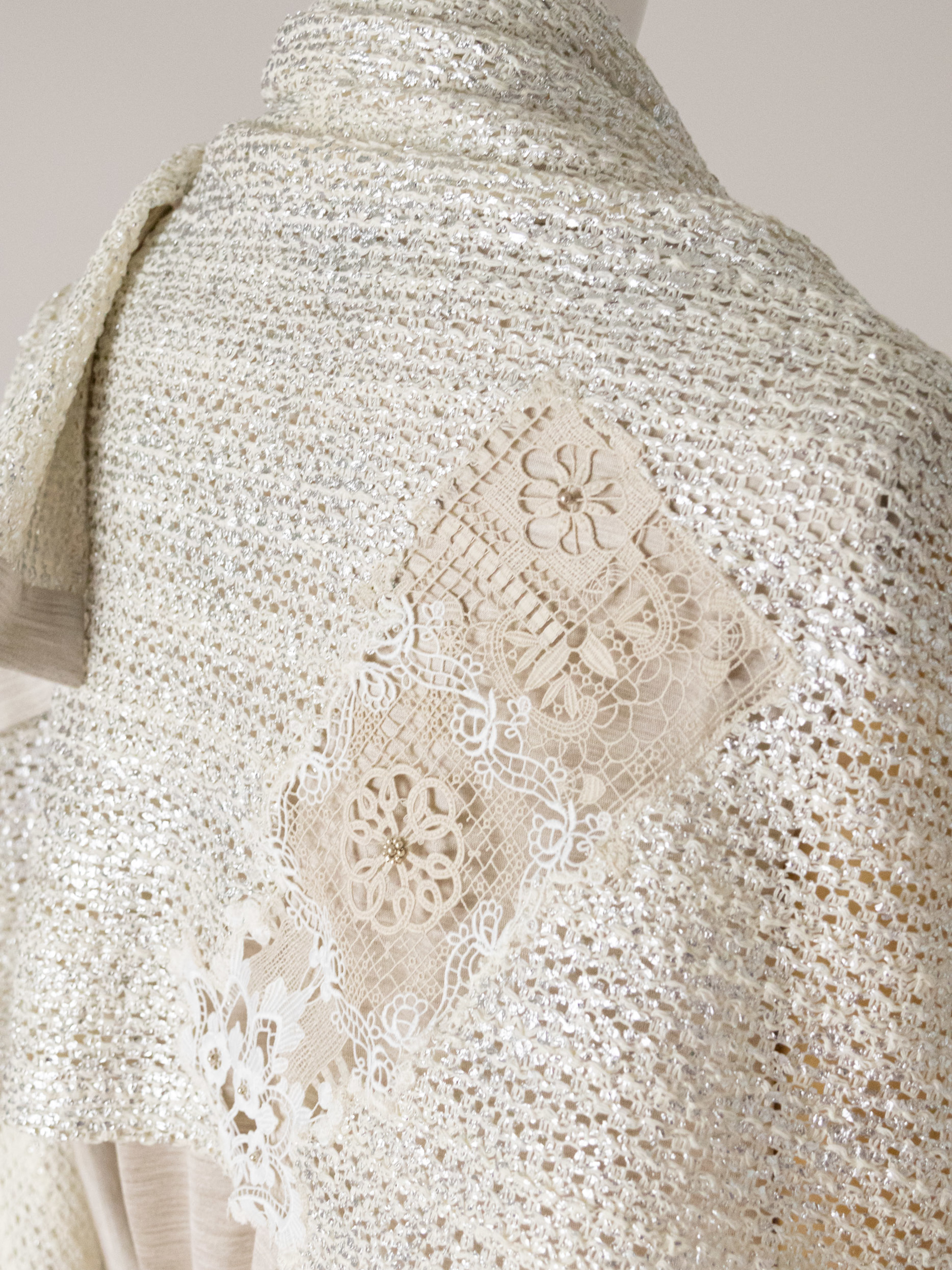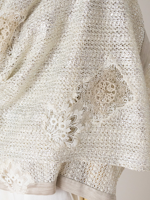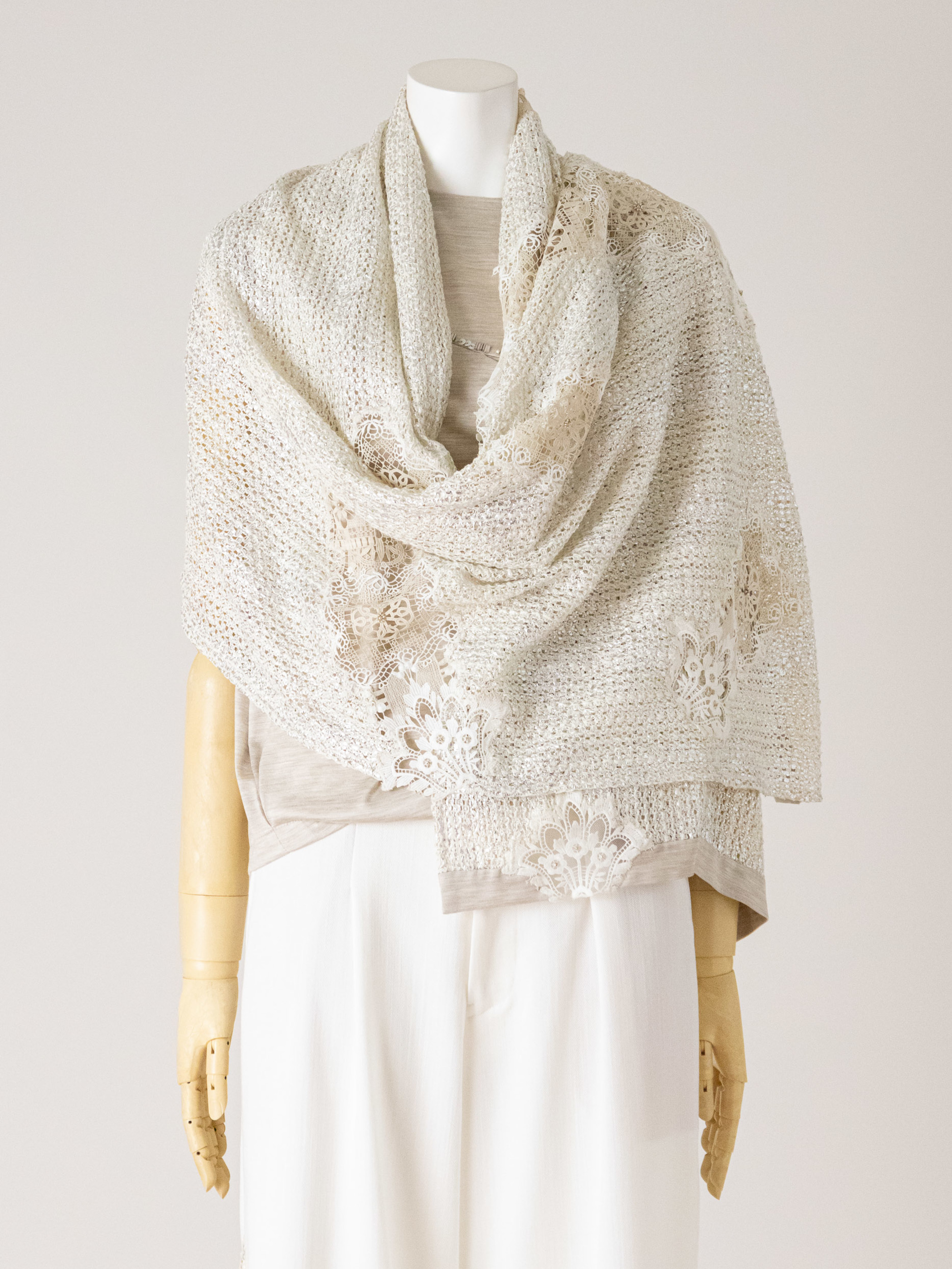 銀糸加工の煌めきで、銀彩や白金彩の陶器を表現したストール。