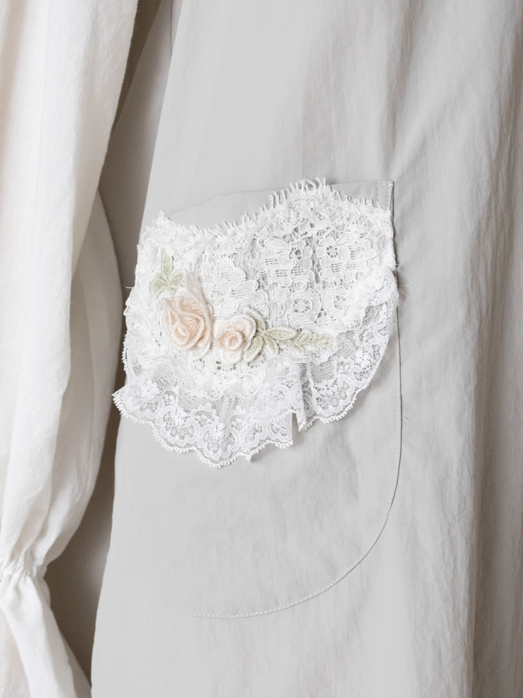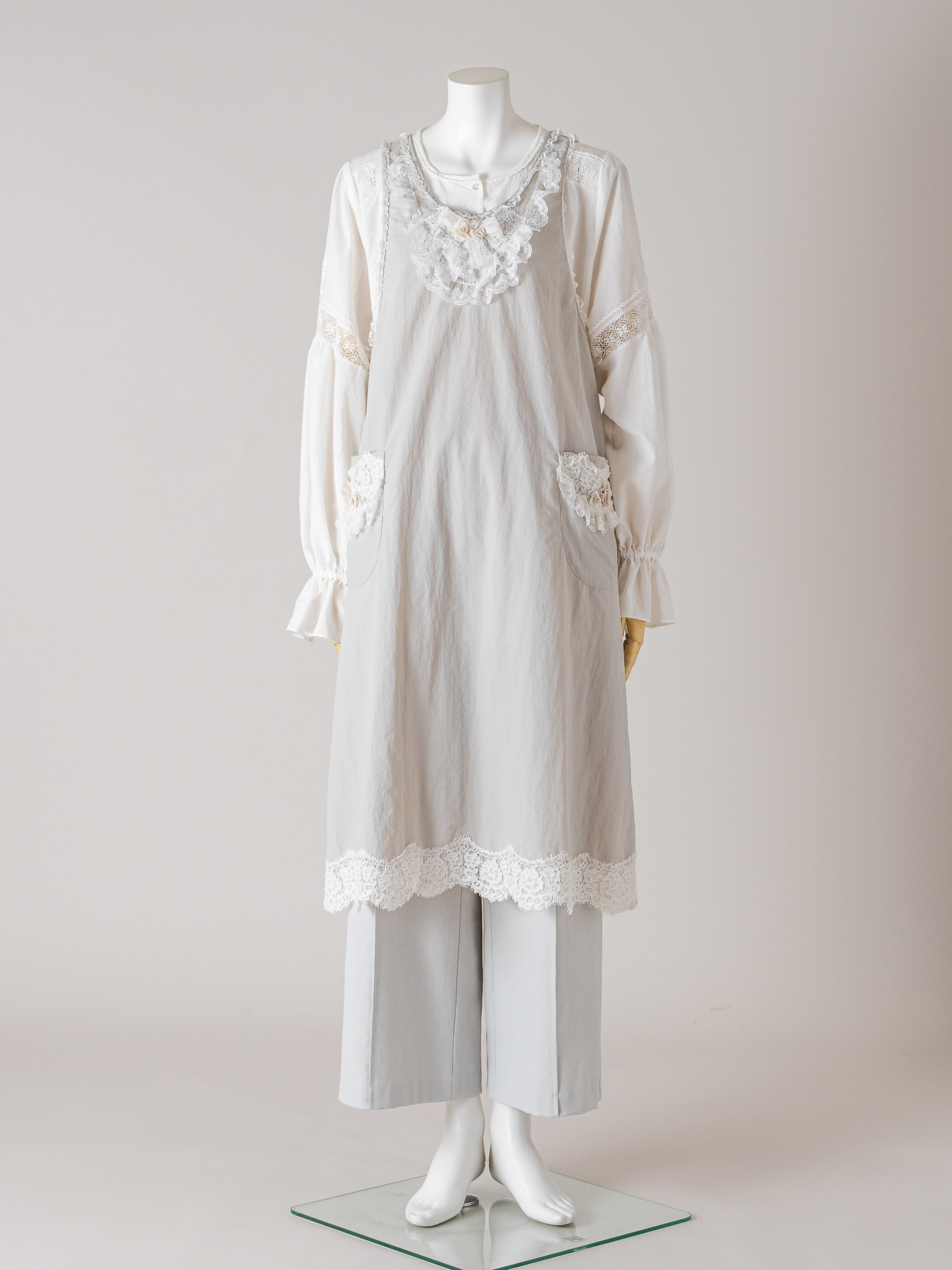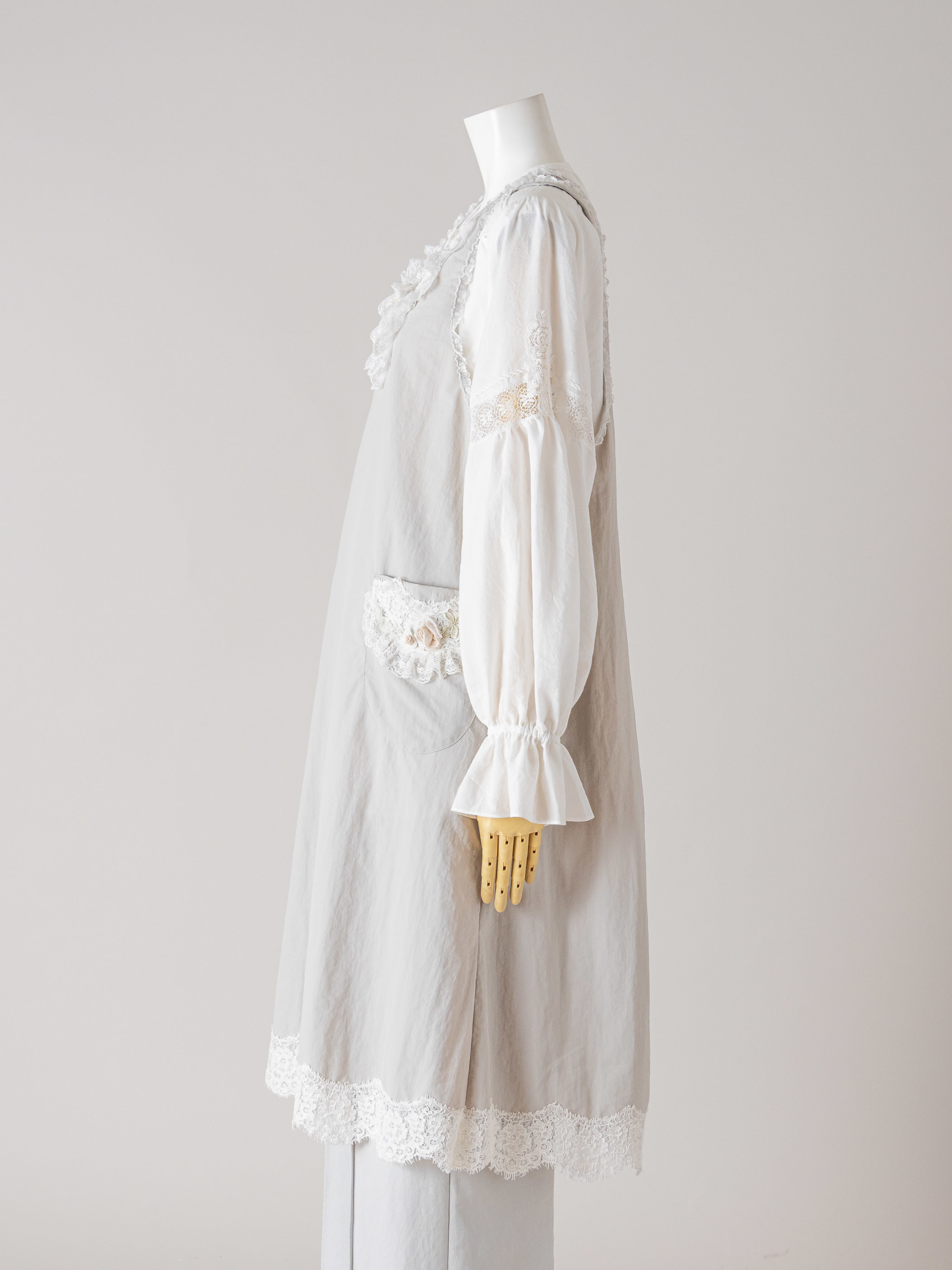 レースと巻きバラが柔らかく華やぐ、後ろドット釦付きの実用的ナイロンエプロンです。