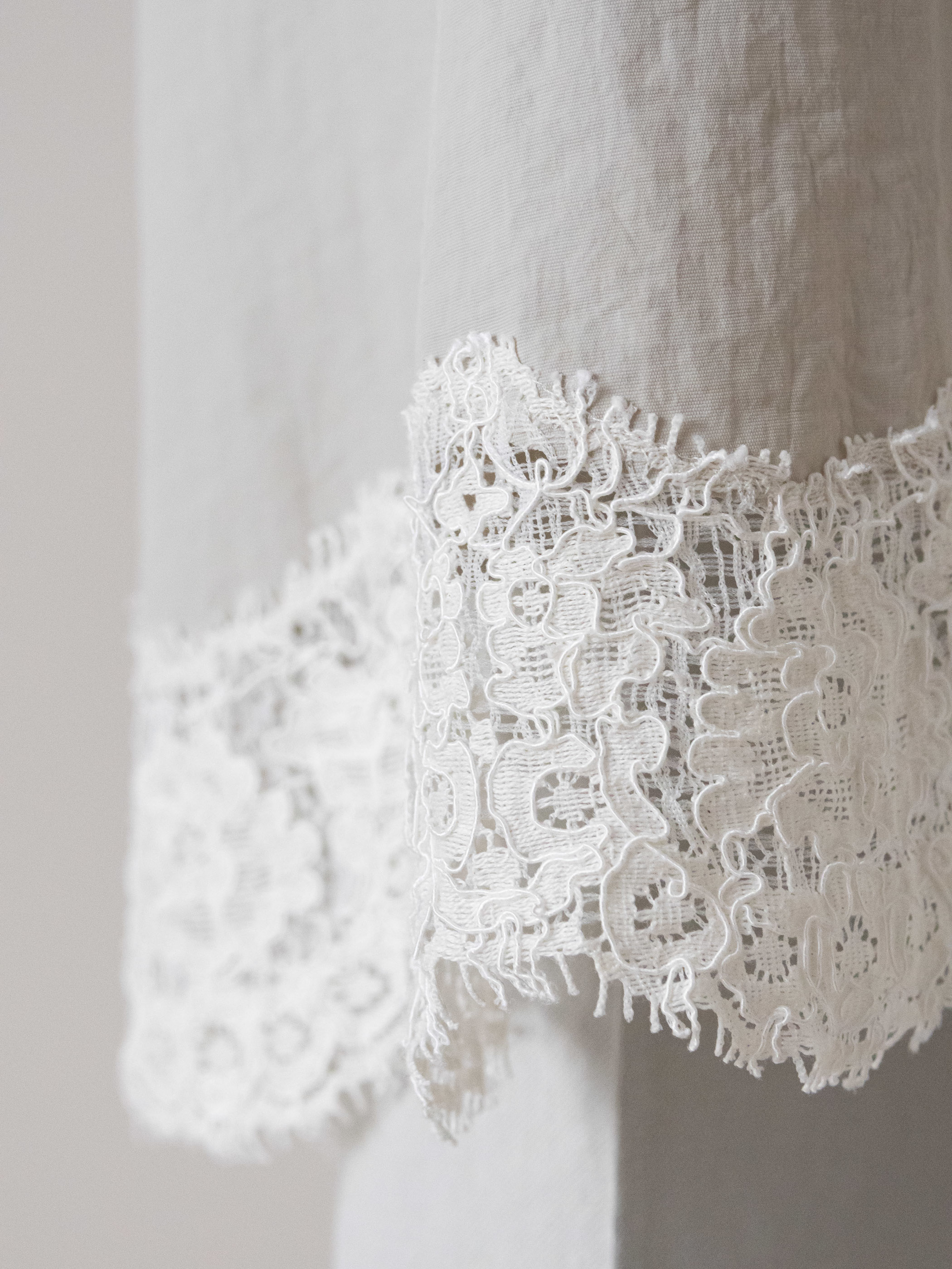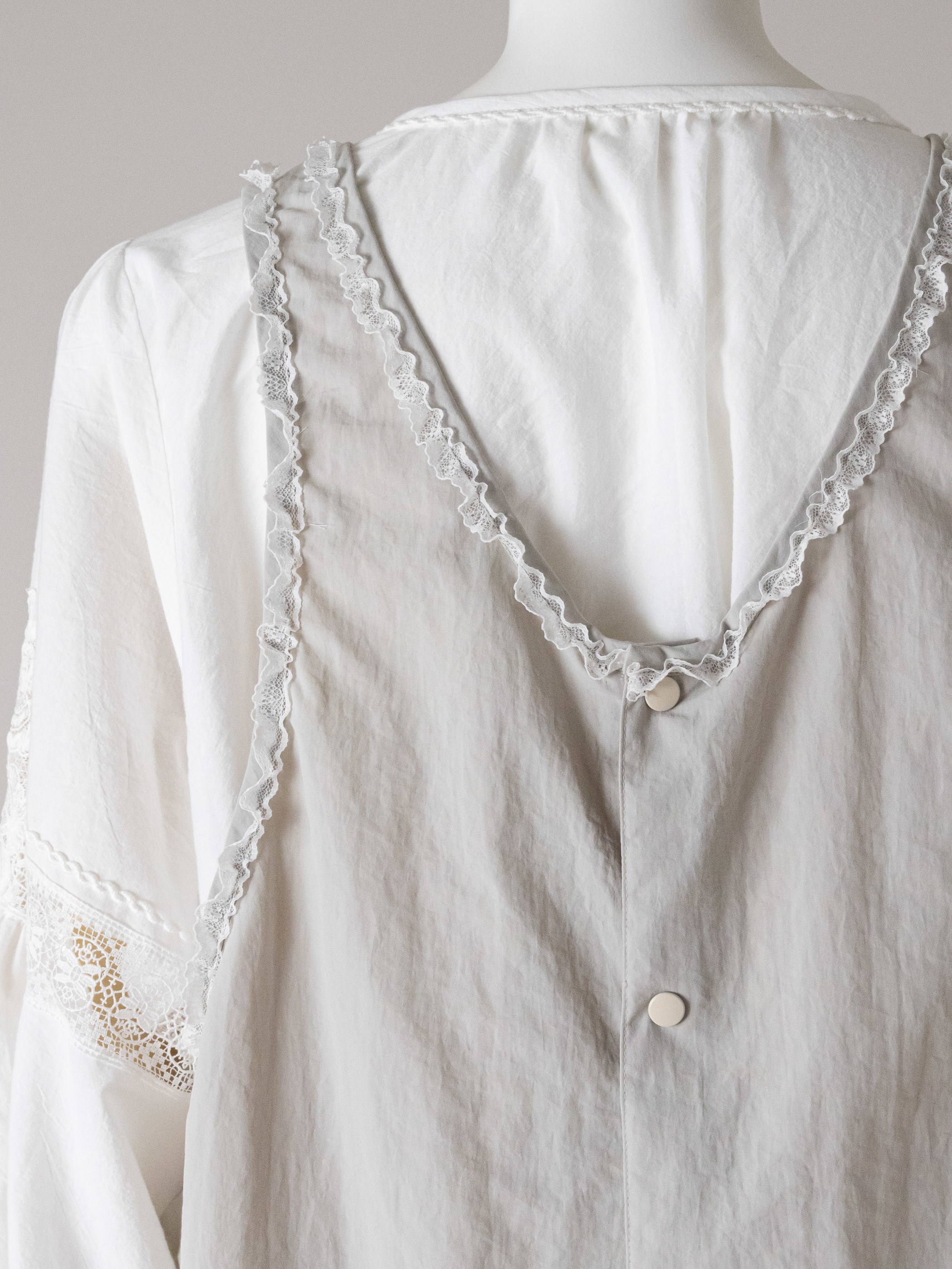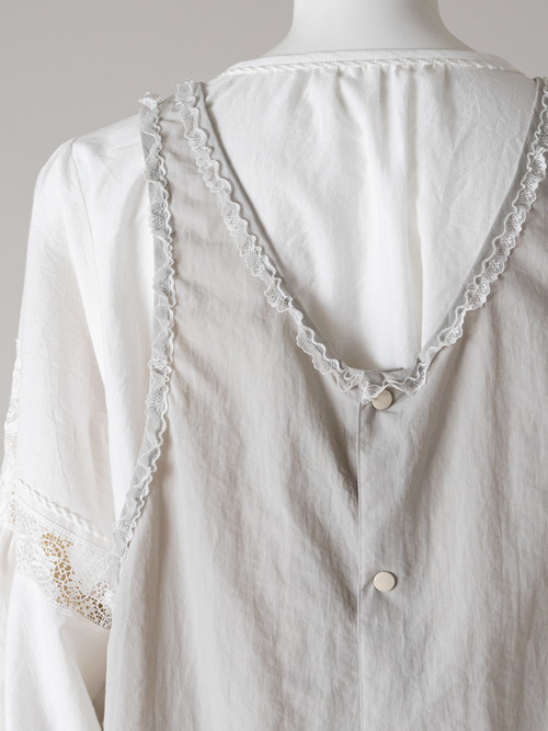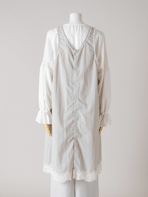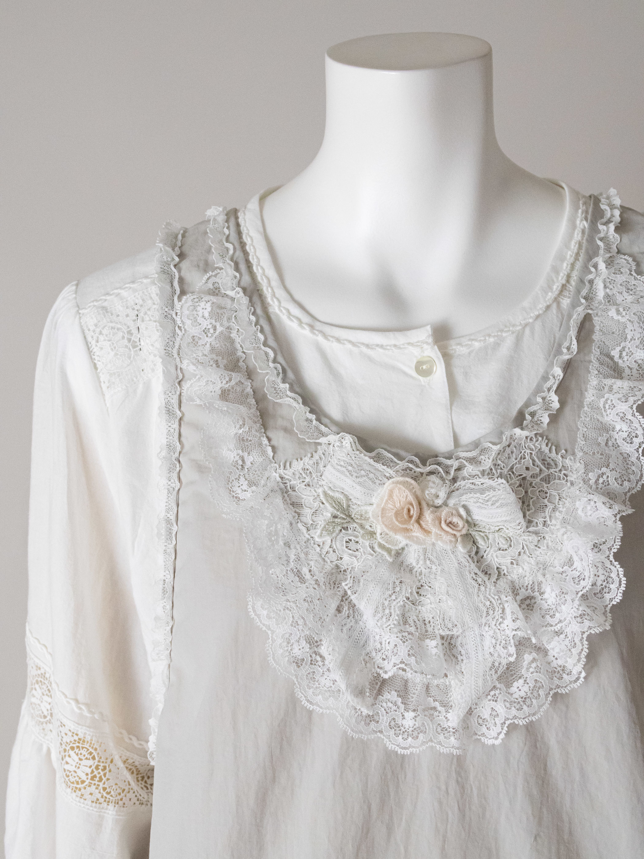 レースと巻きバラが柔らかく華やぐ、後ろドット釦付きの実用的ナイロンエプロンです。