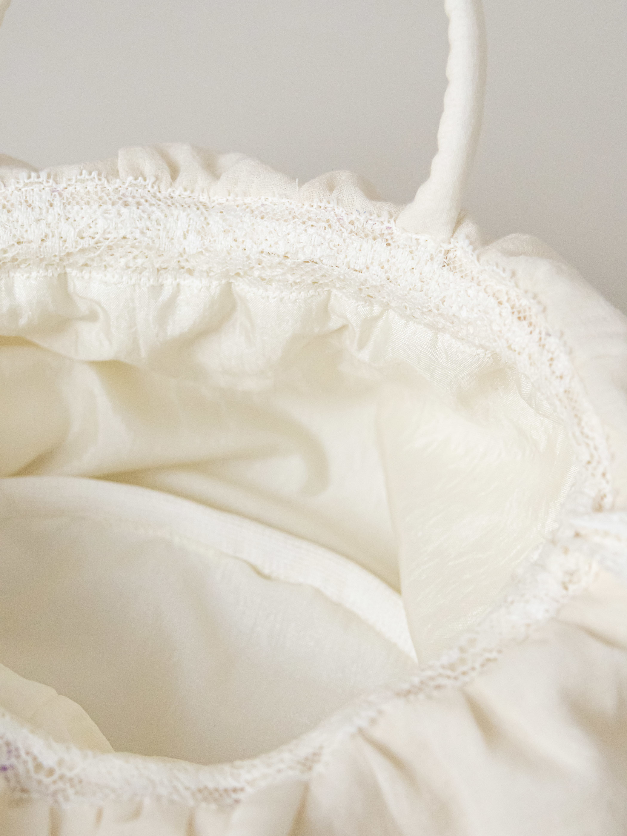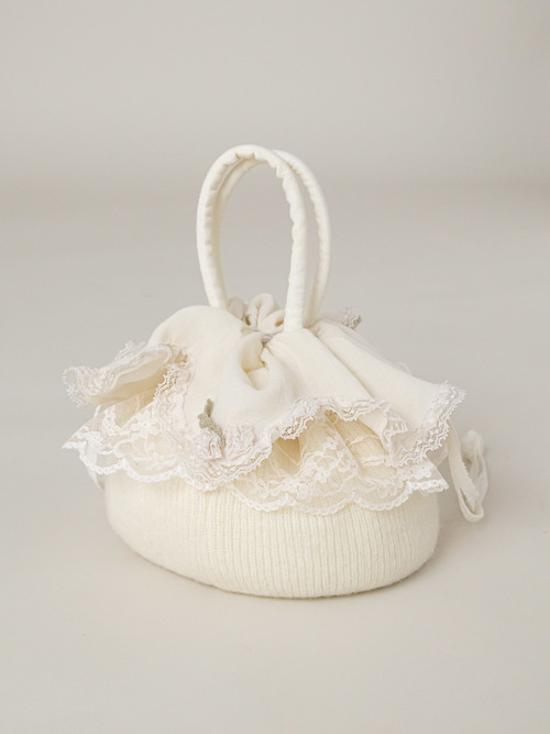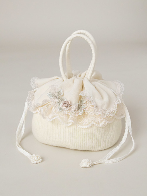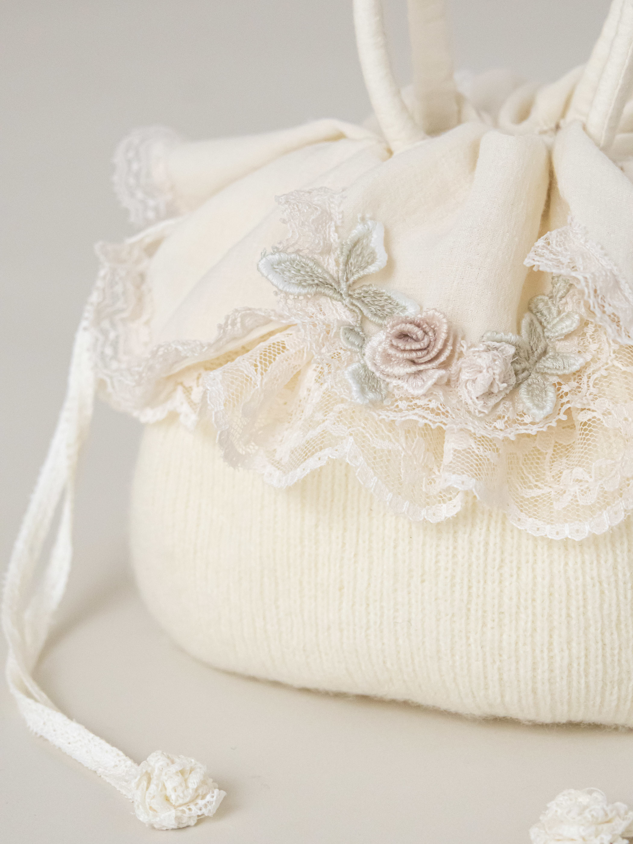 お花のようにフリルが広がる小ぶりなニットの巾着バックです。