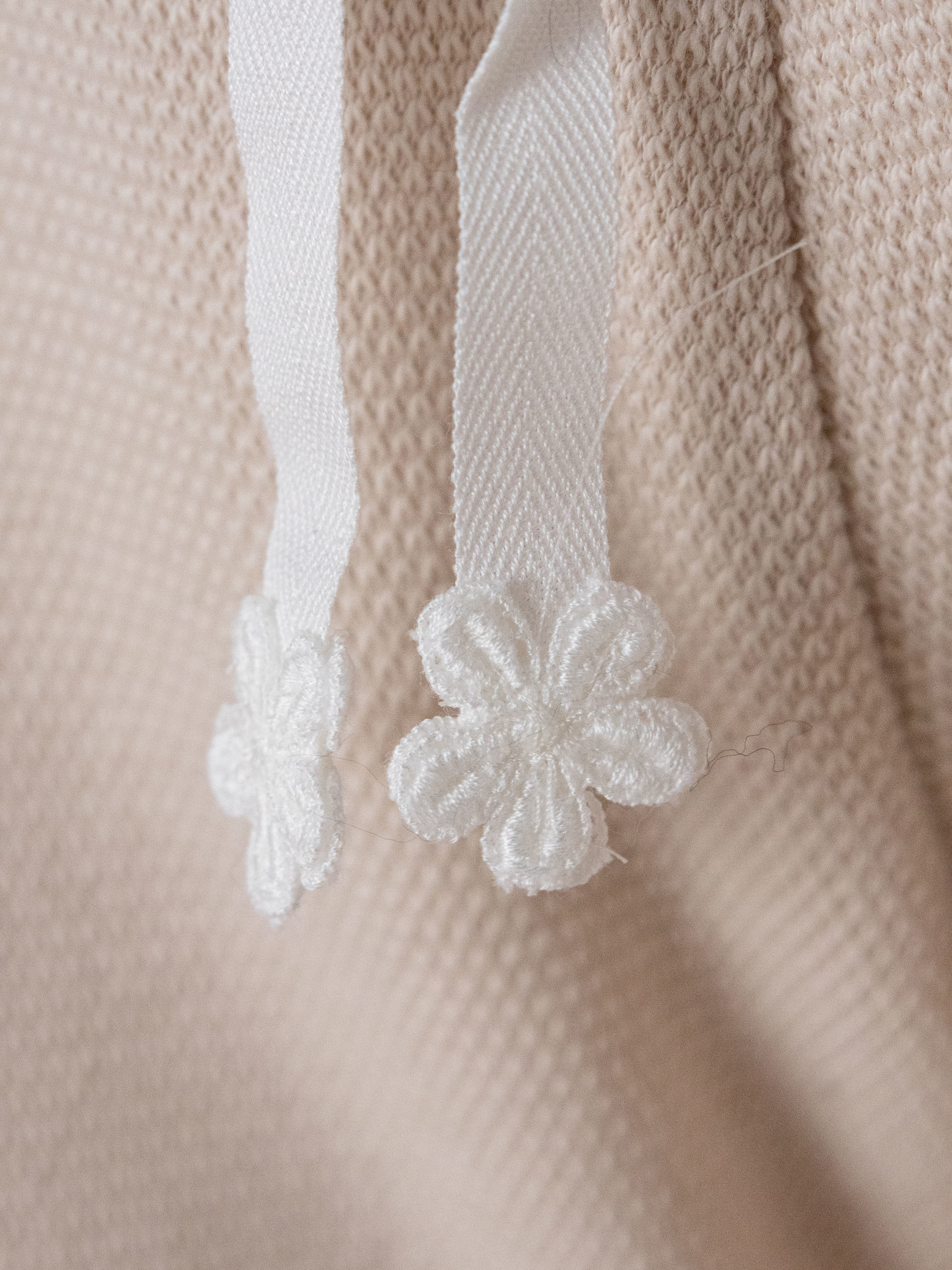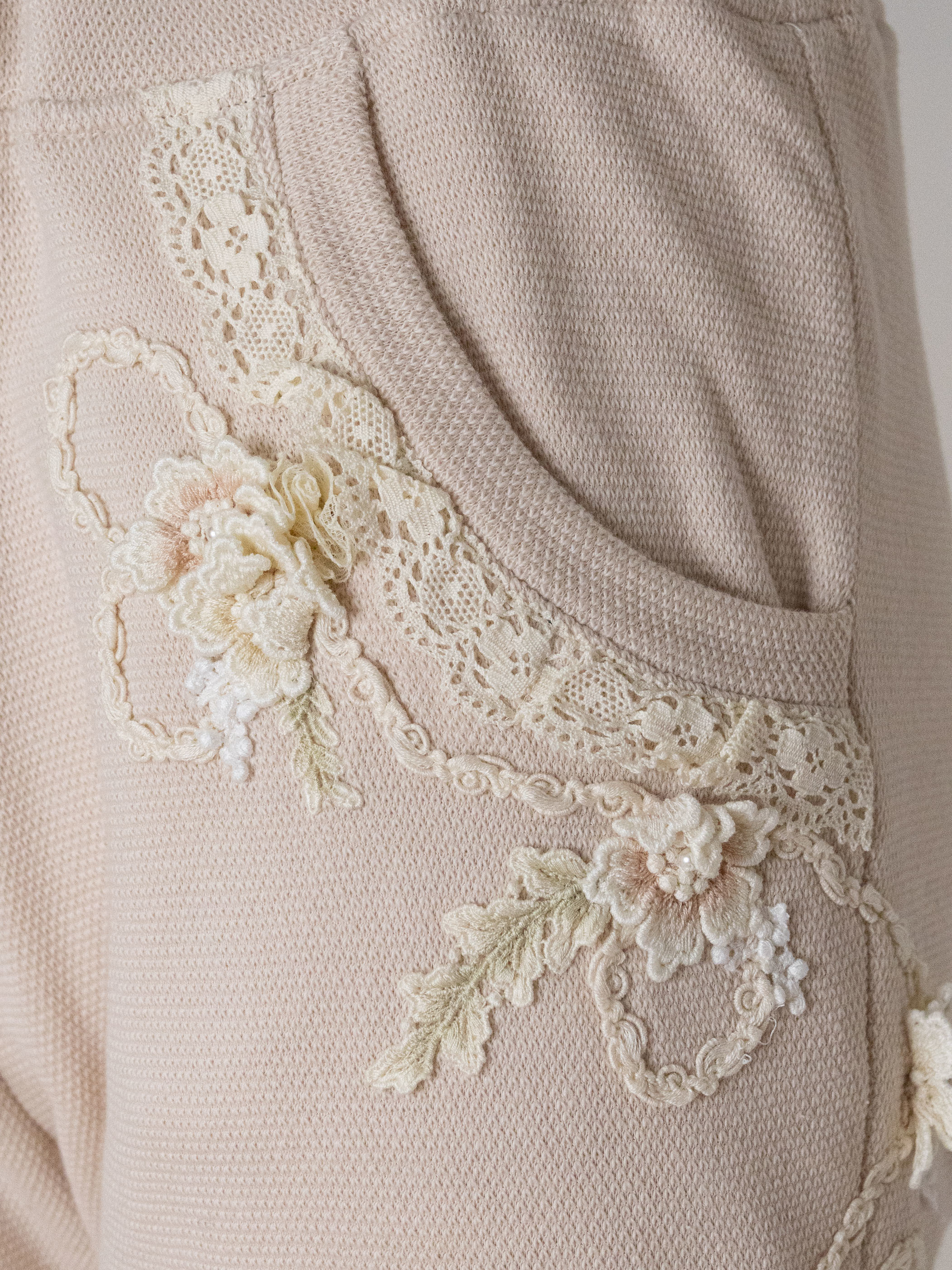 筆染めしたお花や葉っぱのモチーフを流れるようにあしらい、所々に小さなレースのお花もアクセントにしています。