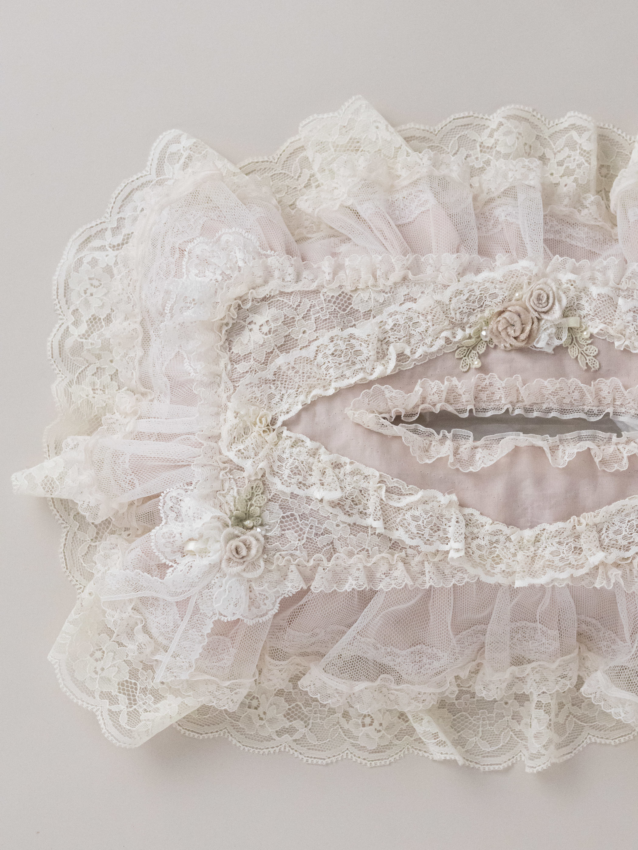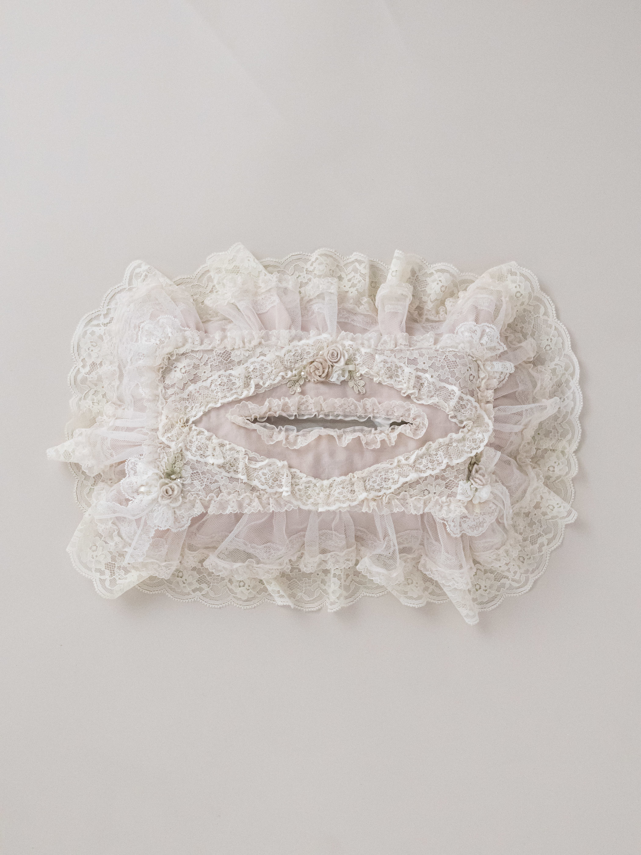 ふんわりと重なるフリルとレースに、小さなお花を添えたティッシュボックスケースです。