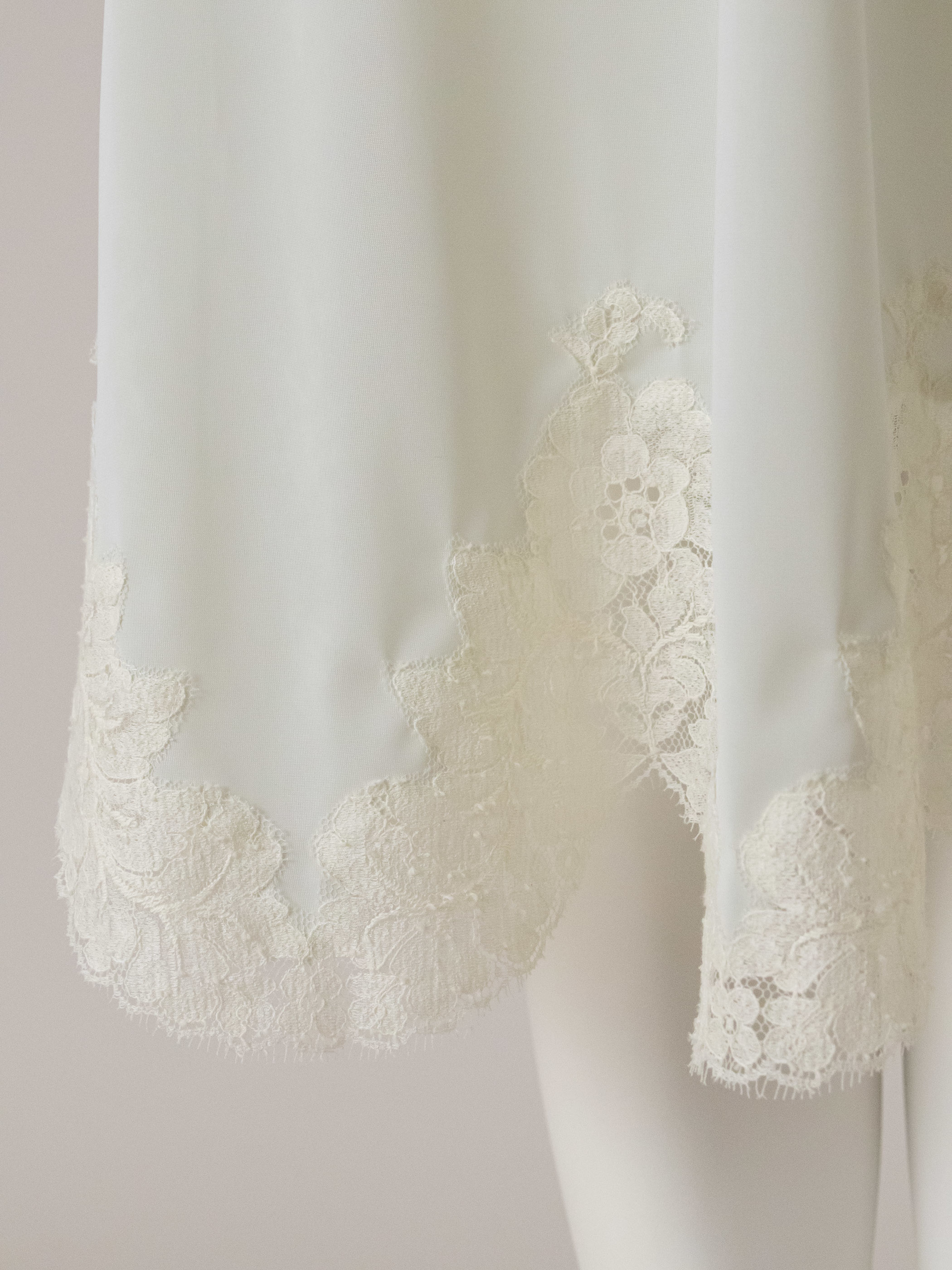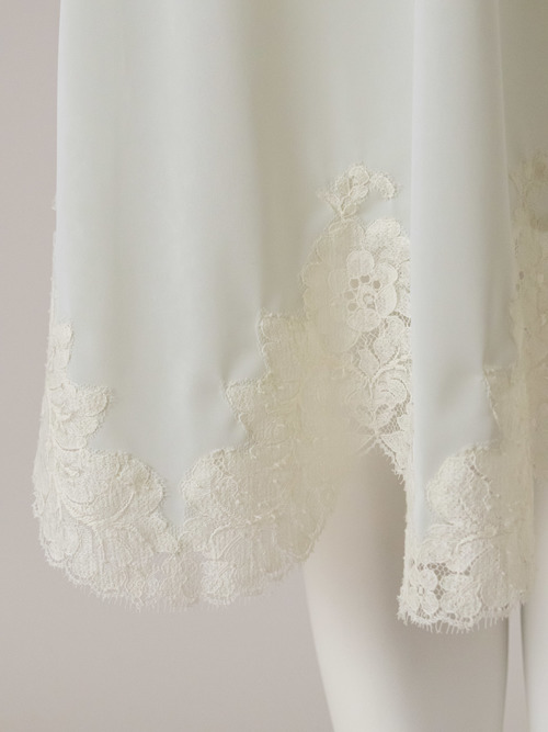 裾にはスカラップの大胆な柄のリバーレースをあしらい、エレガントな印象に仕上げました。