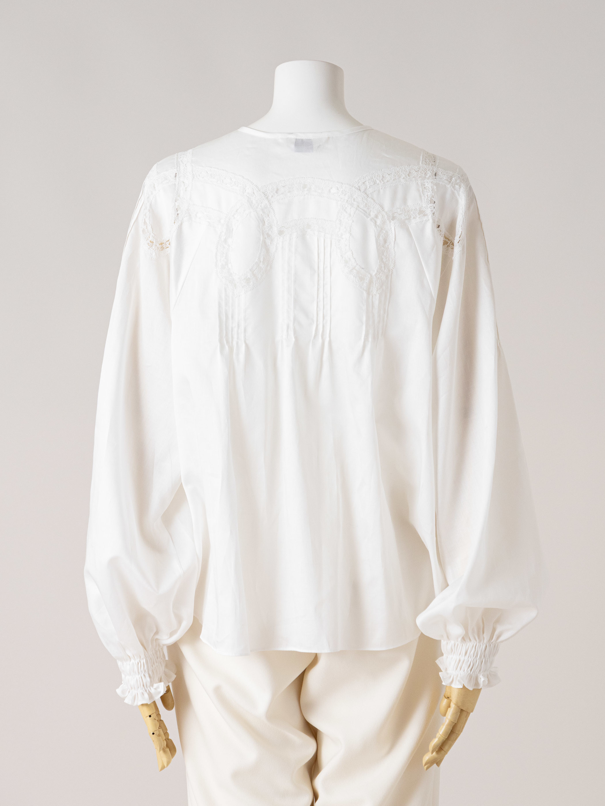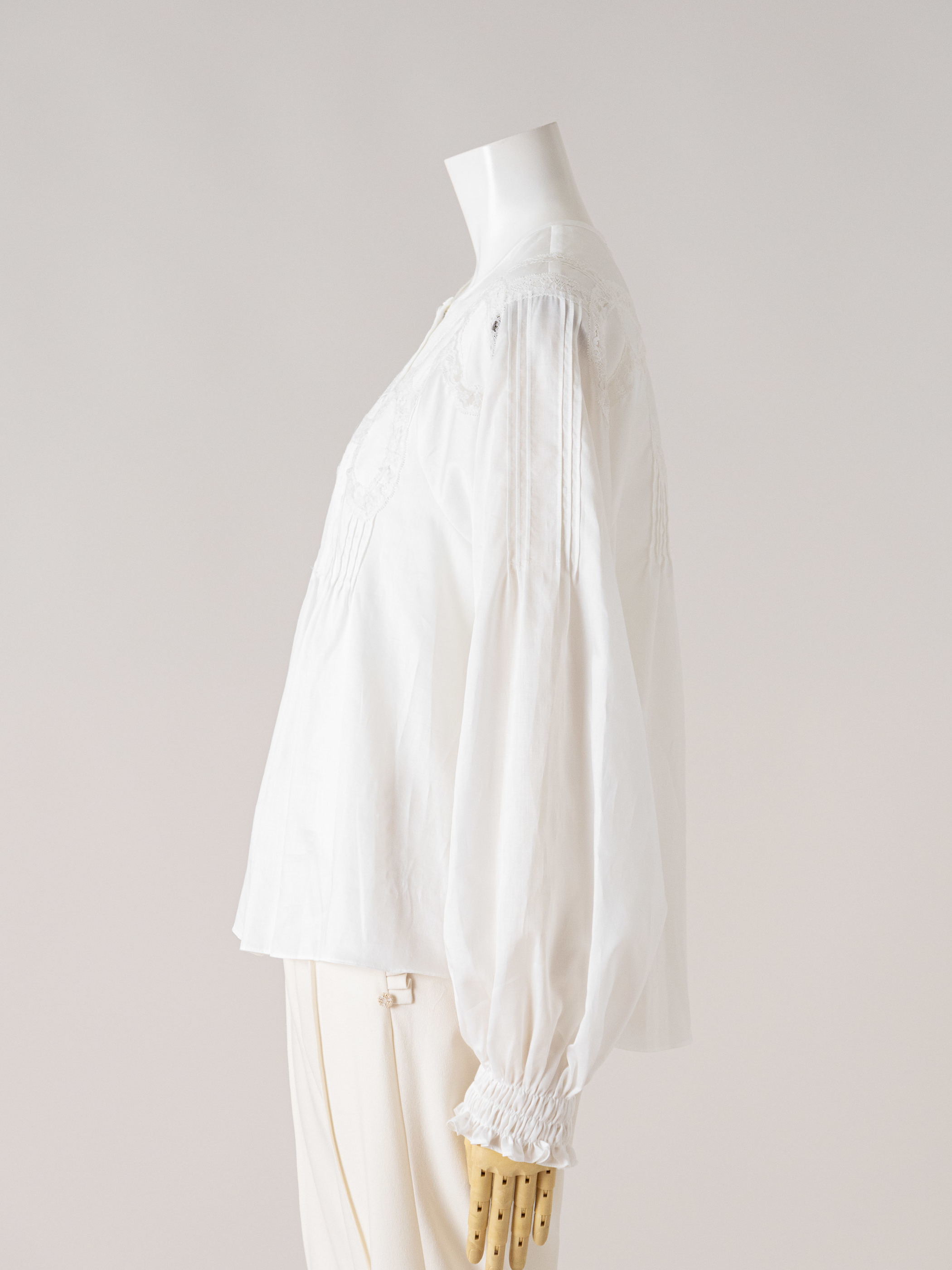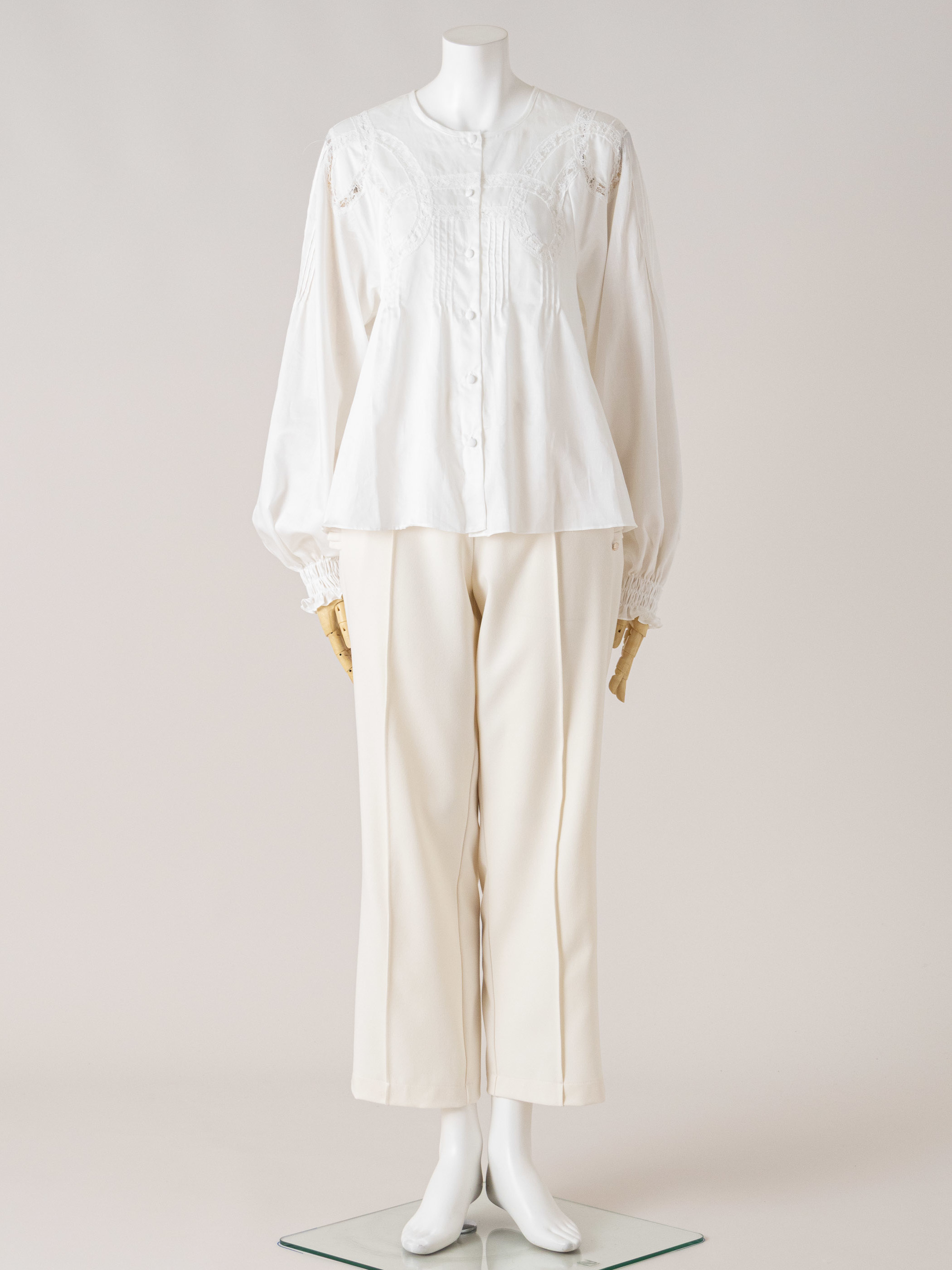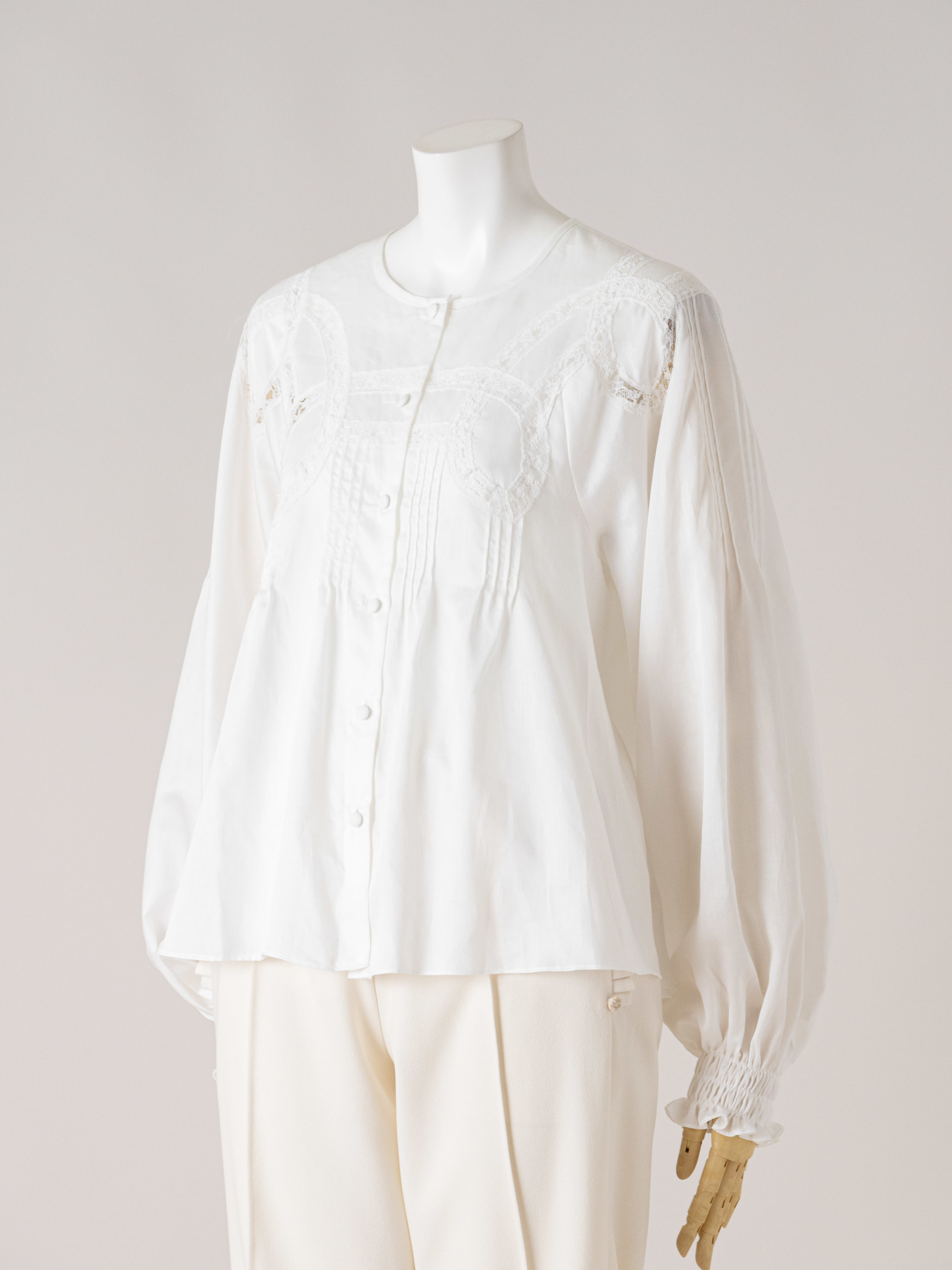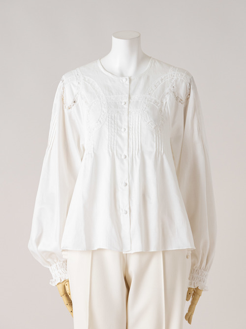 光沢感のあるサテンにリバーレースで絵を描くように透かしたブラウスです。
