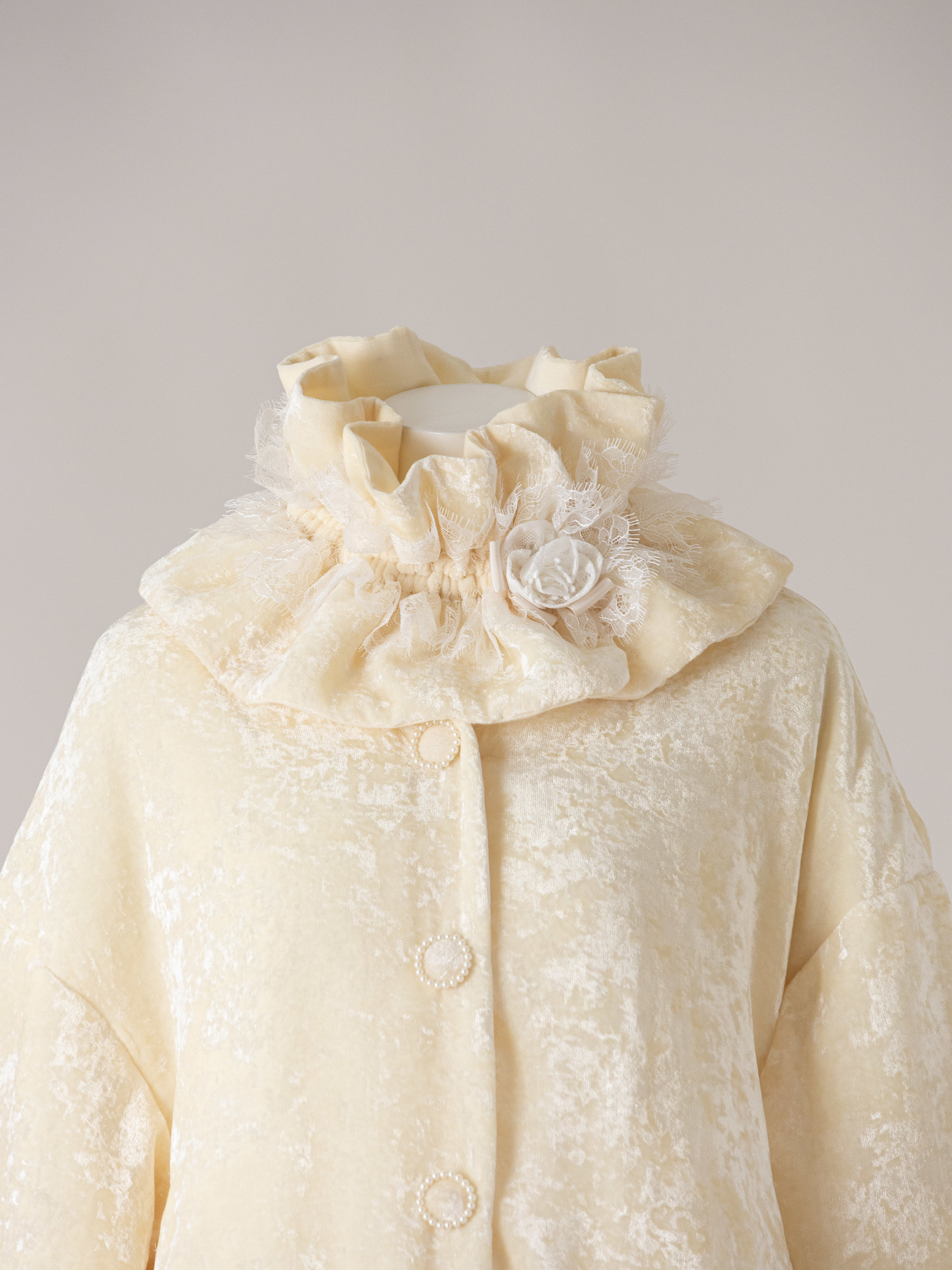 美しい光沢のベルベットに綿をキルトしたフリルマフラーです。