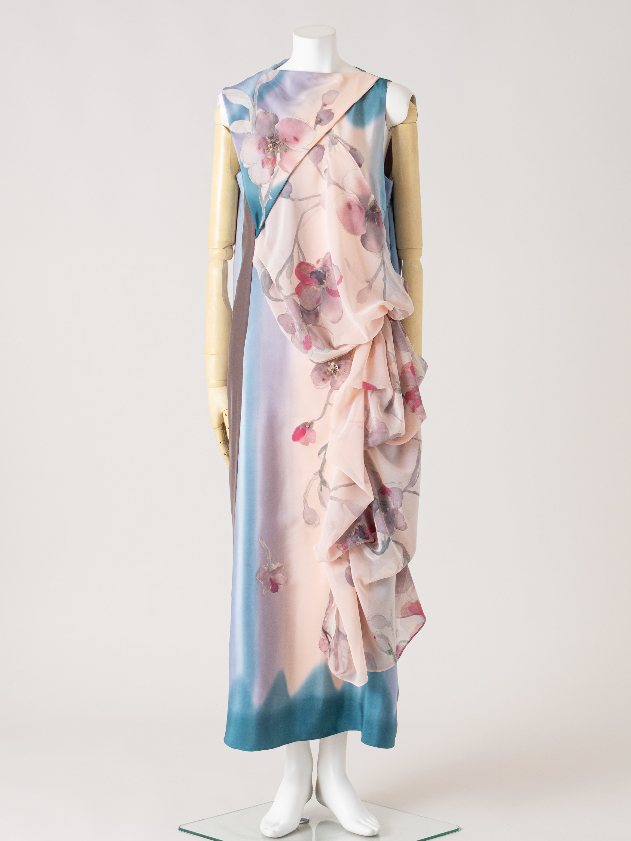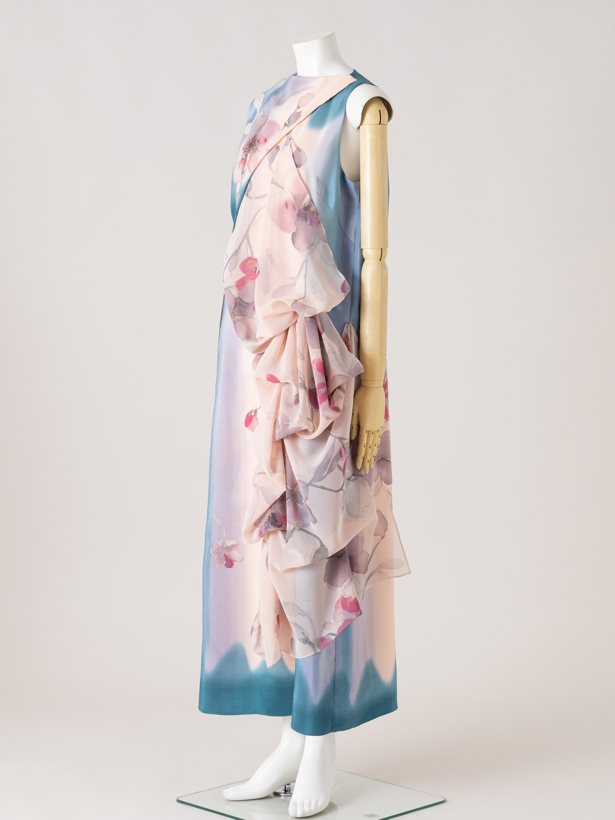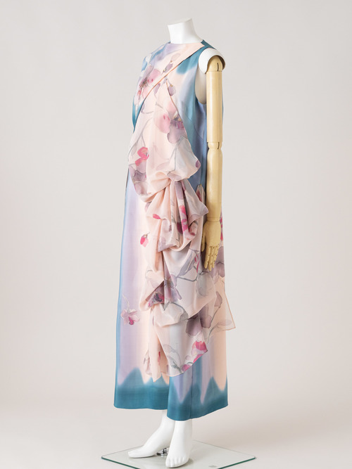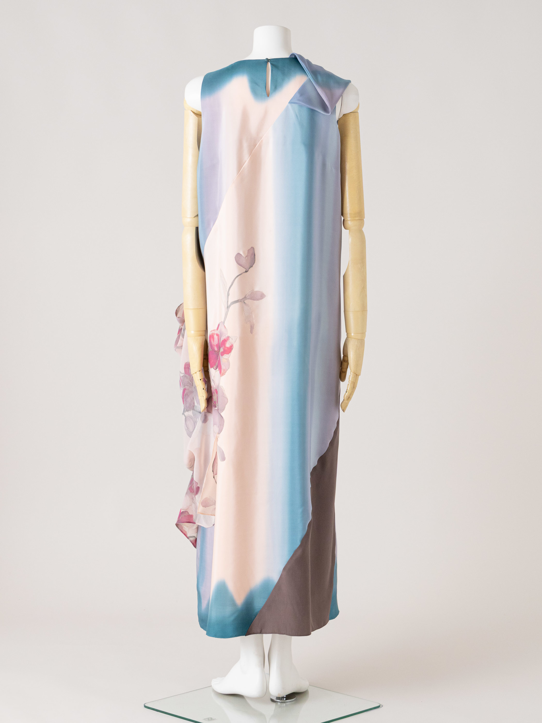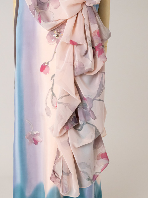 グラデーションのシルクサテンとプリントシフォンを組み合わせドレープを描くことでシャープな印象の中にさりげないロマンティシズムを感じさせるデザインに仕上げております。