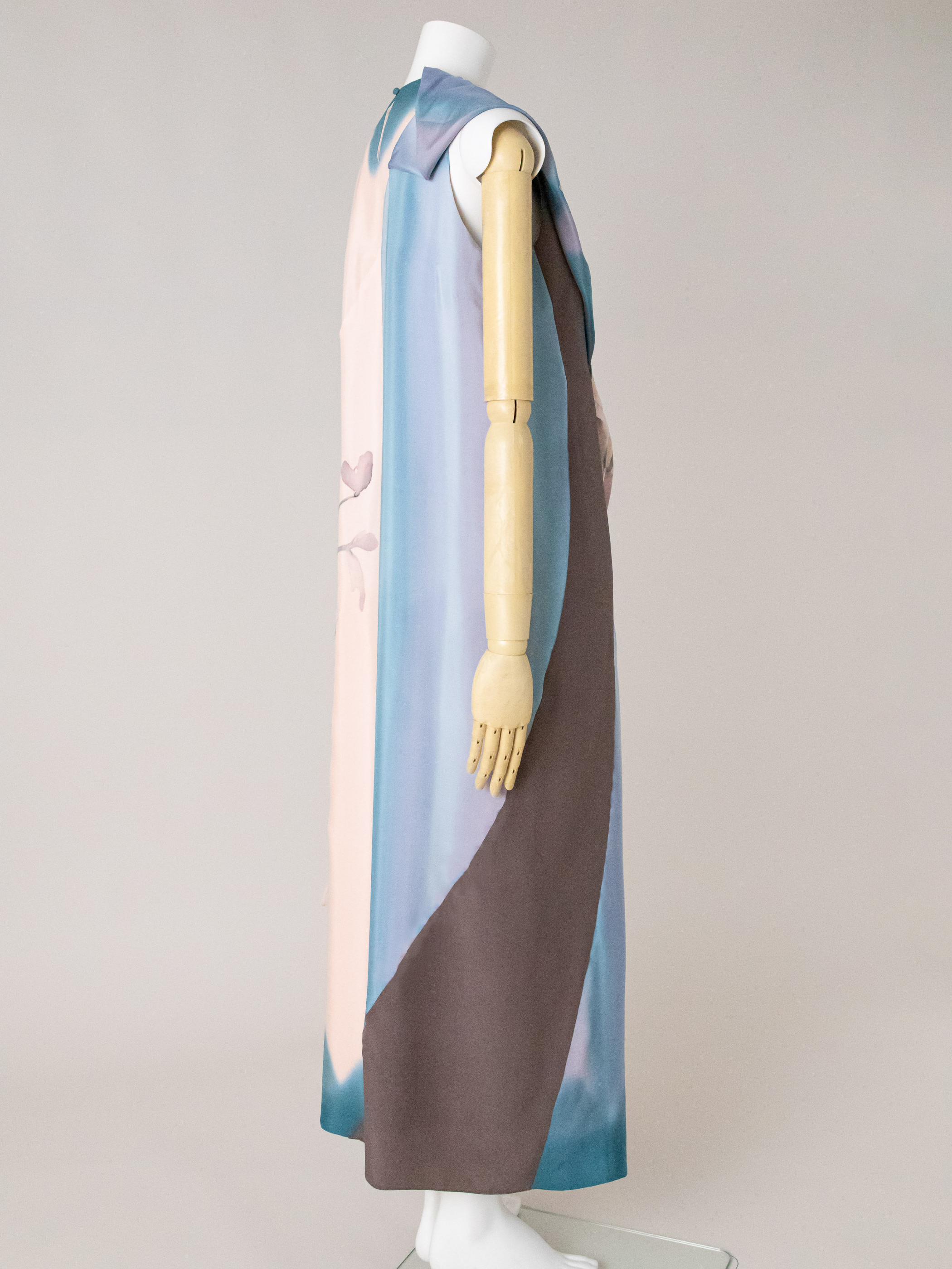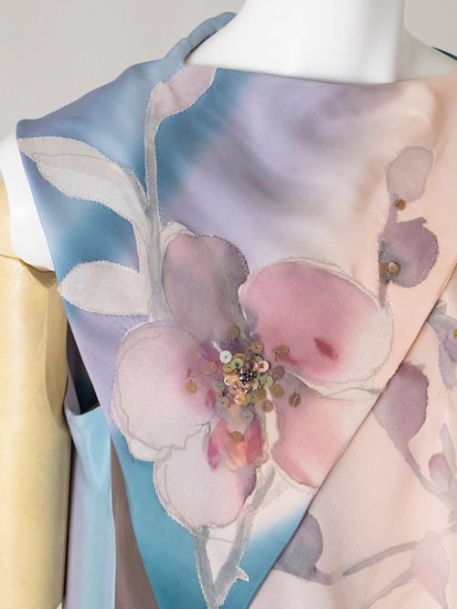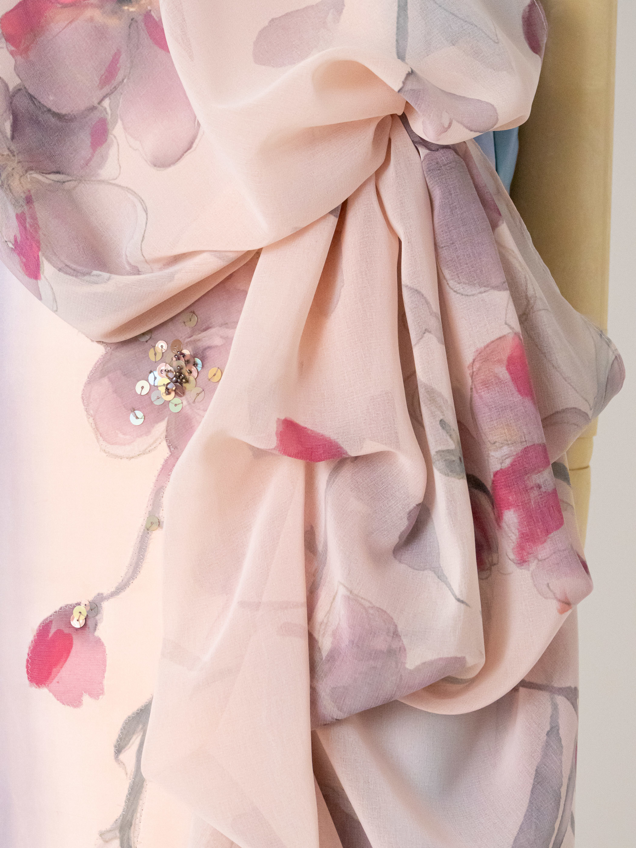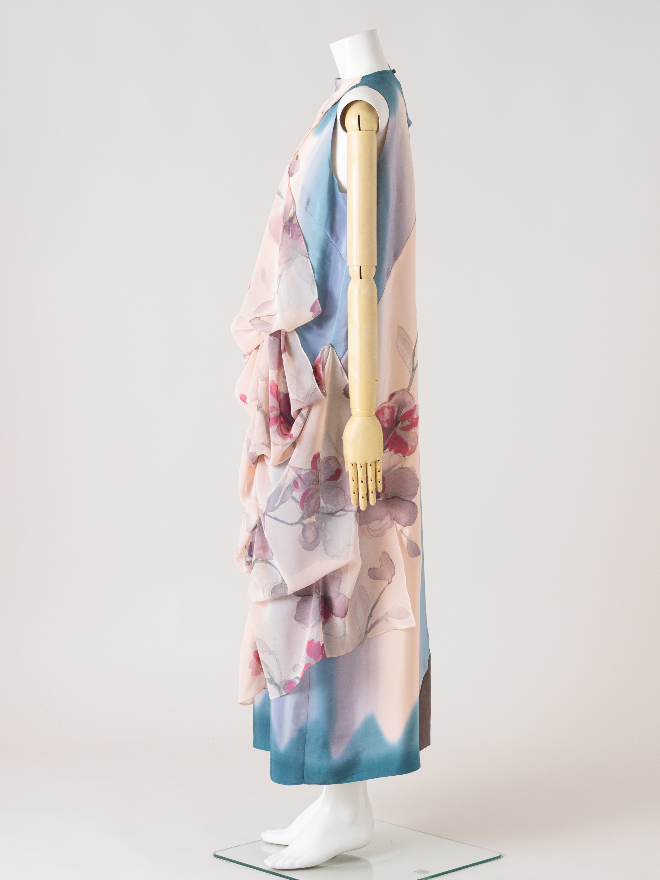 グラデーションのシルクサテンとプリントシフォンを組み合わせドレープを描くことでシャープな印象の中にさりげないロマンティシズムを感じさせるデザインに仕上げております。