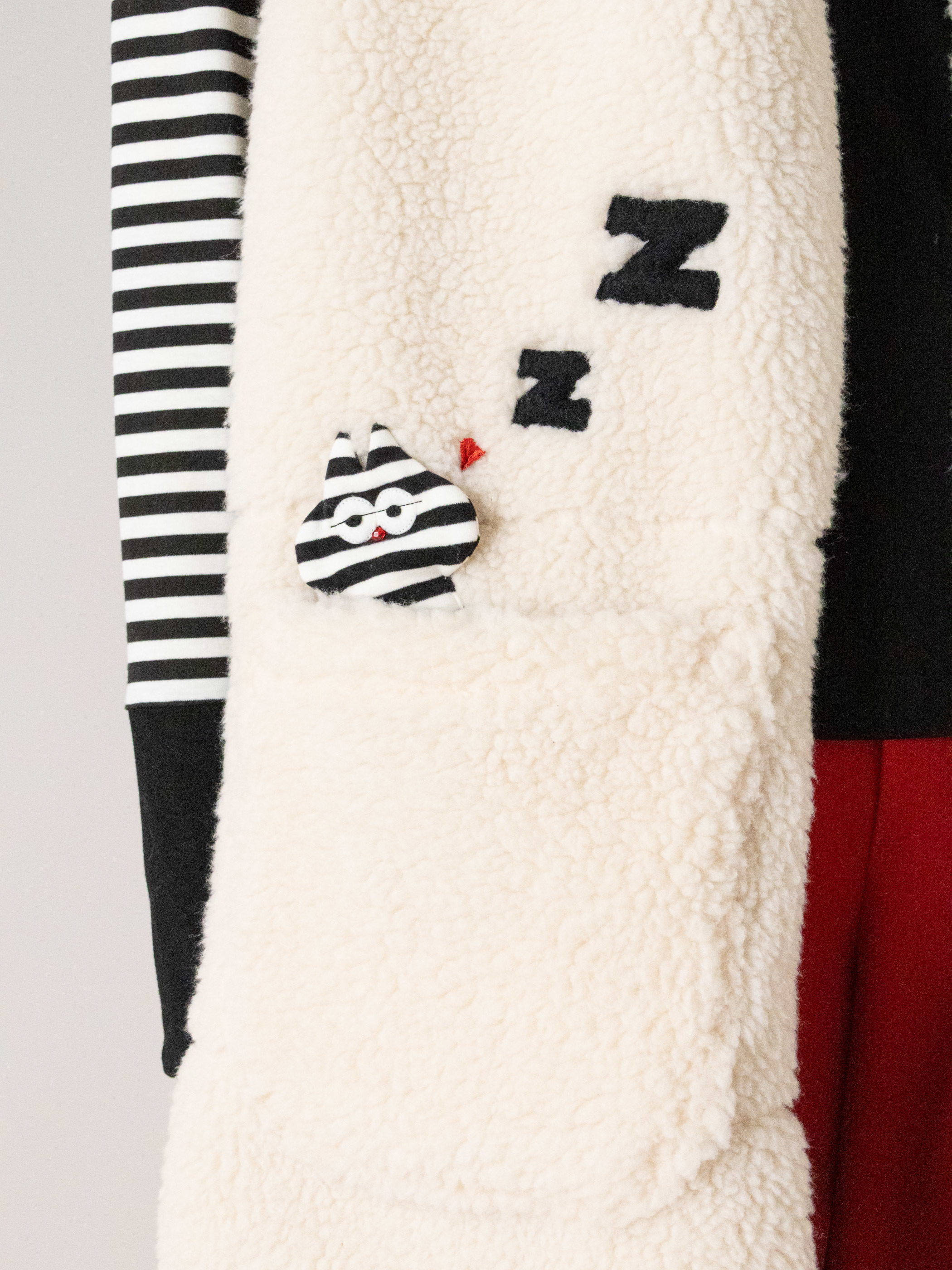 ポケットをお布団代わりにしているボブキャットに、控え目な猫耳フードで遊び心を演出しています。