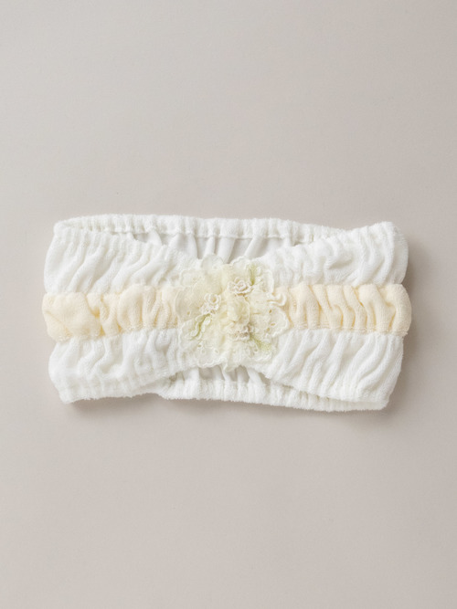 中心に綿レースや筆染めのお花、ギャザーレースなどをあしらい、ポイントにしています。