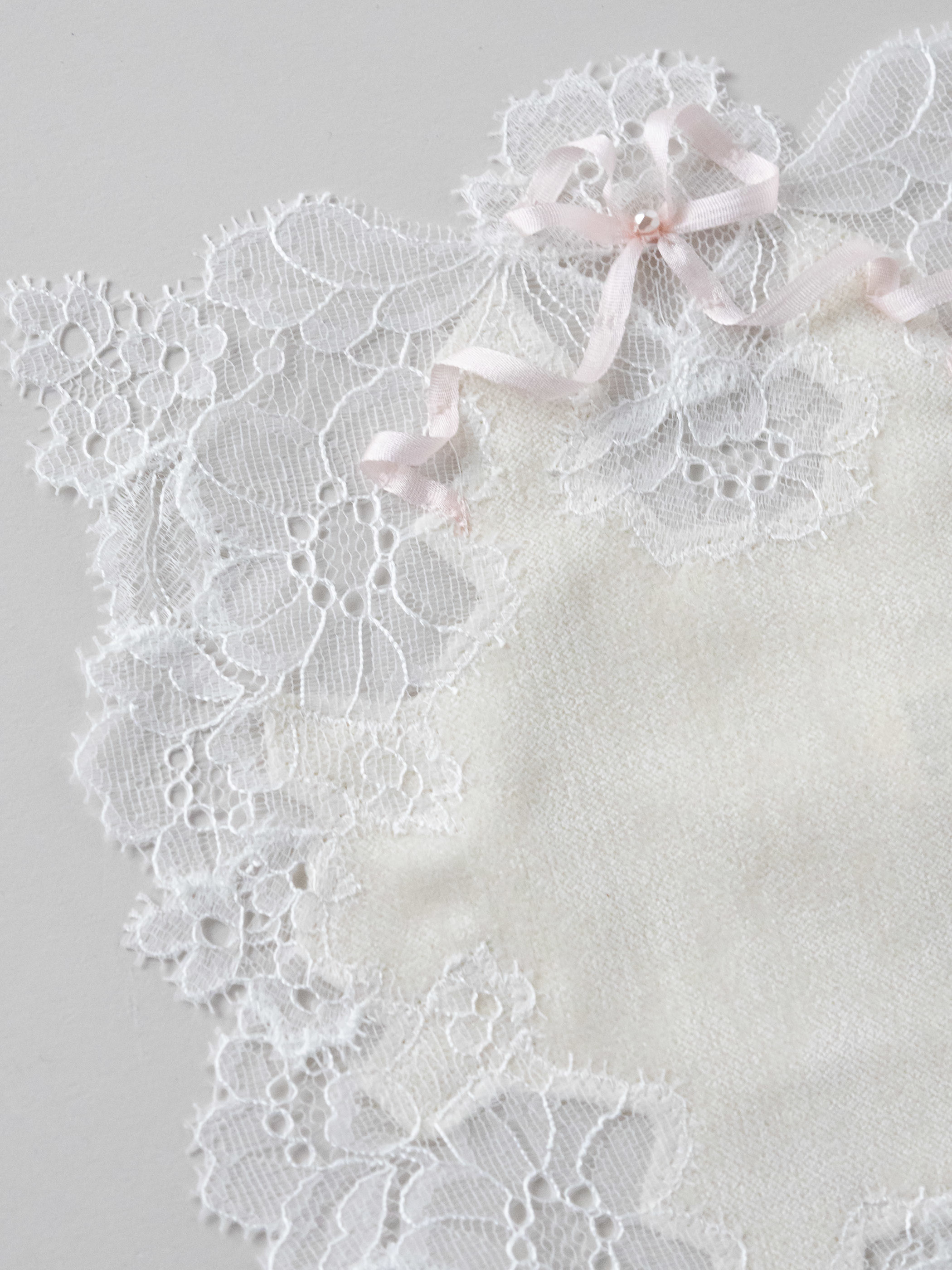 光沢感のある別珍素材を使ってリバーレースの透明感がより際立ったようにデザインしました。