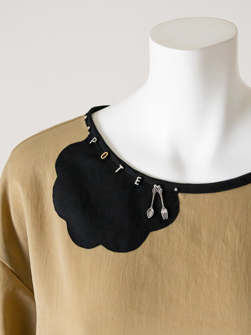 襟元にはナイフとフォークのチャームに合わせ、ランチョンマットのように花を配置しております。