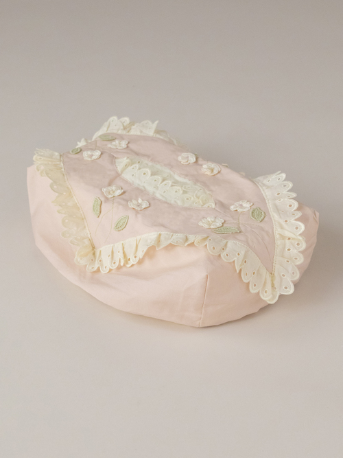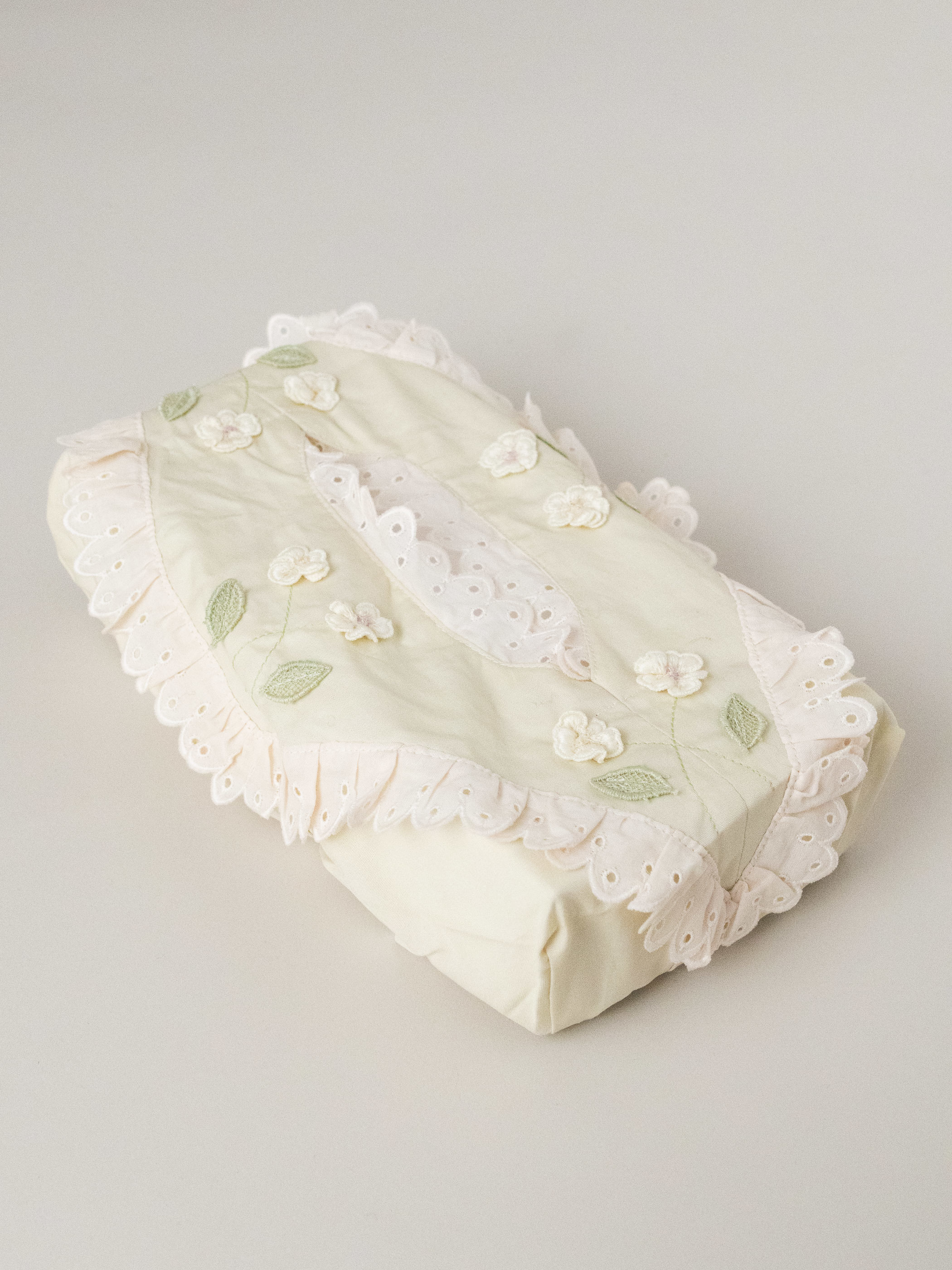 綿レースをあしらったシンプルなティッシュボックスカバーです。