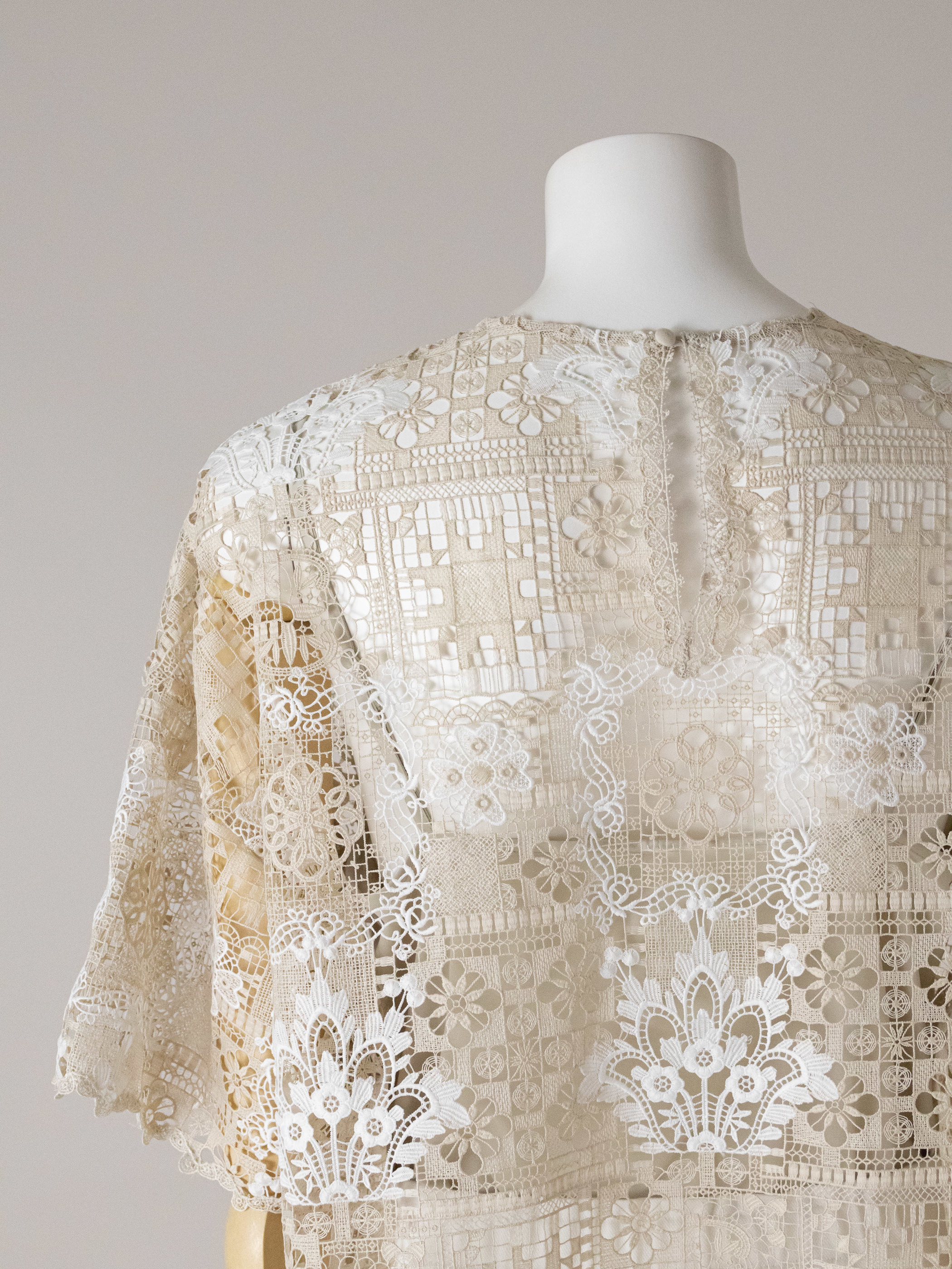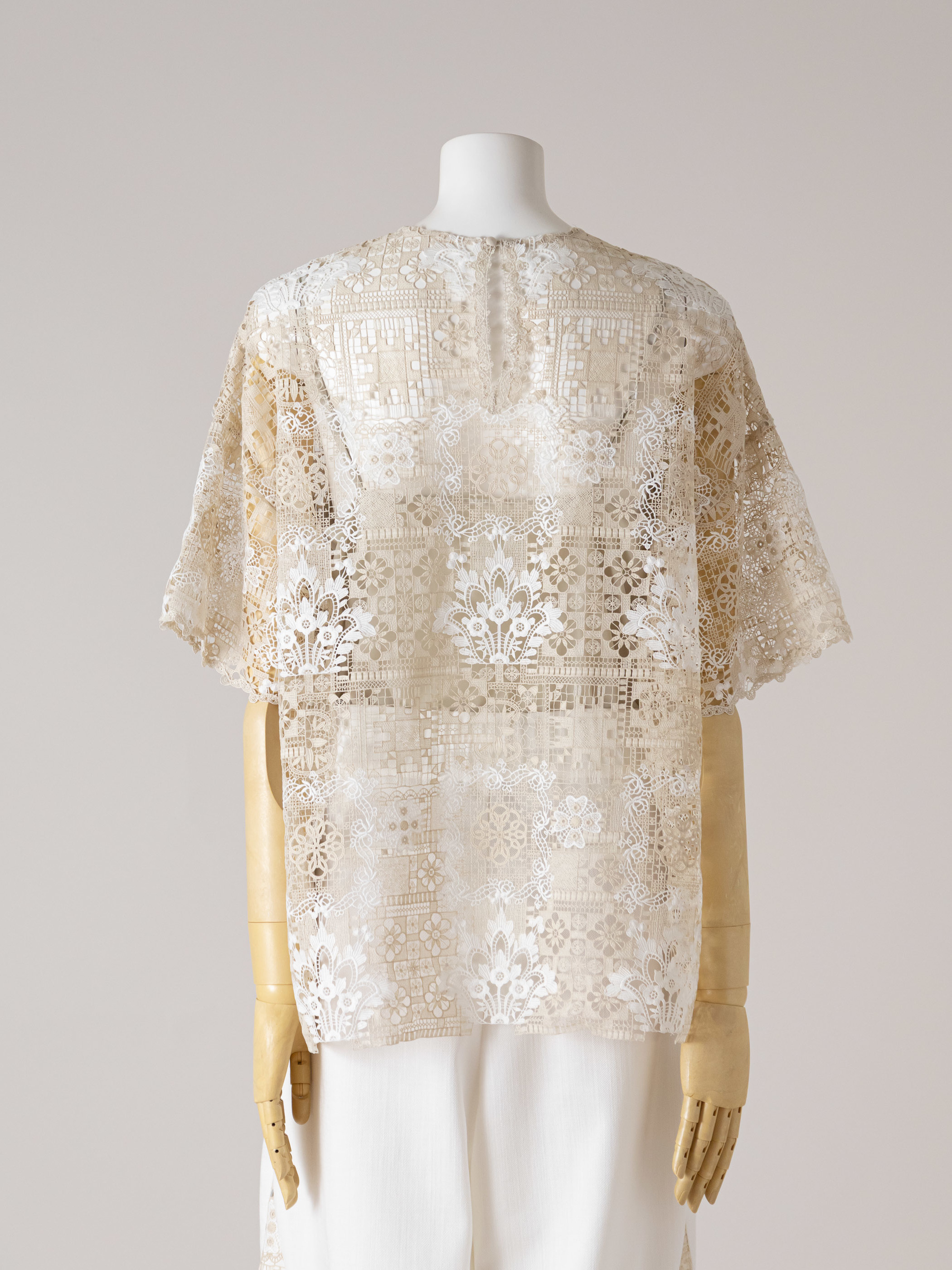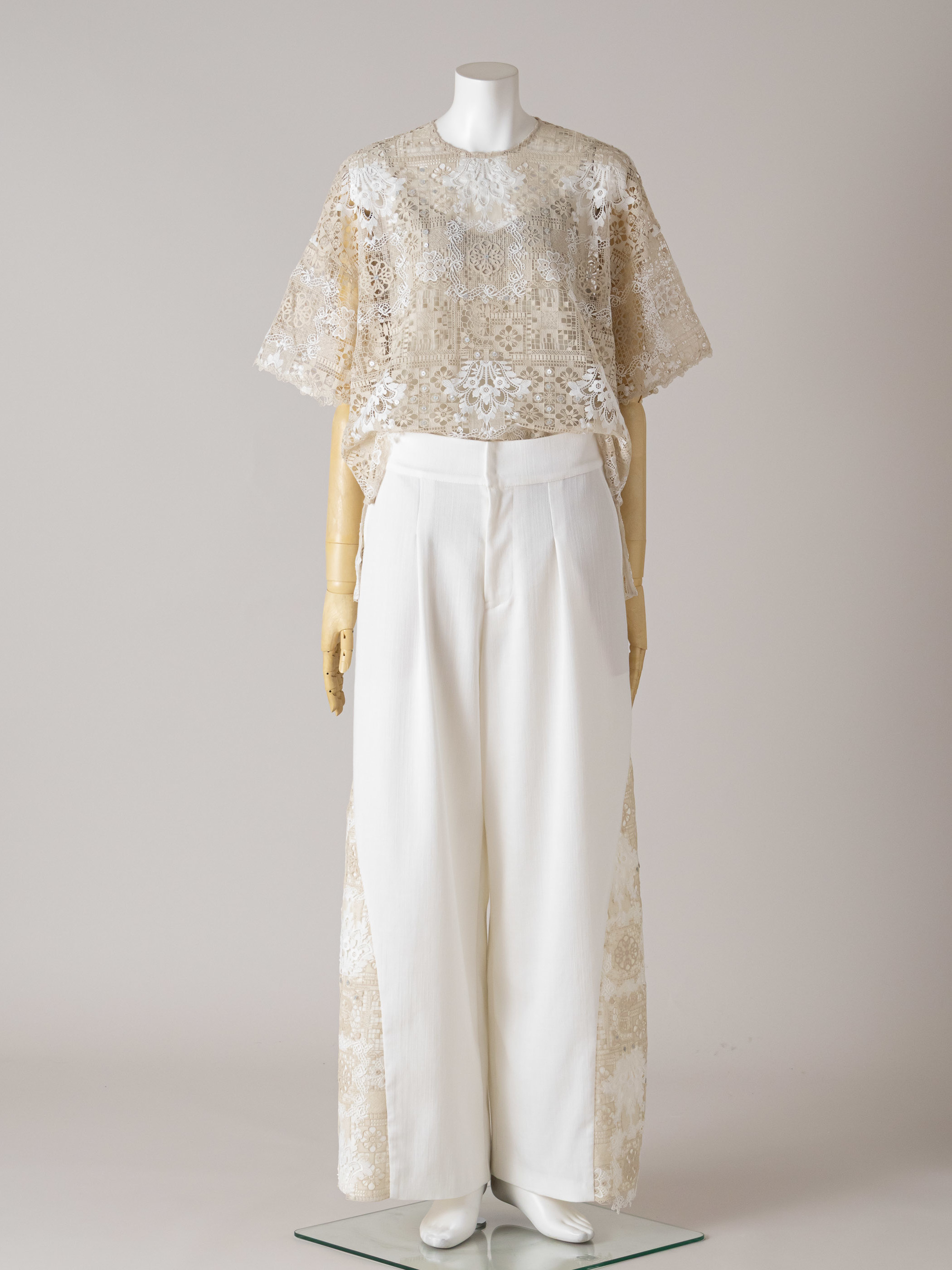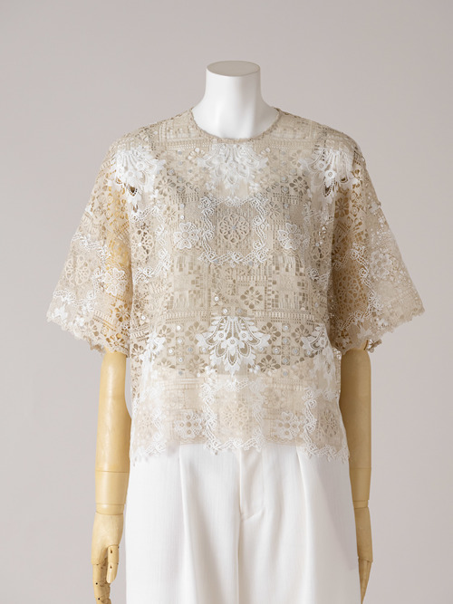 お花や幾何学柄が交差するエレガントなレースを全面にあしらったトップスです。