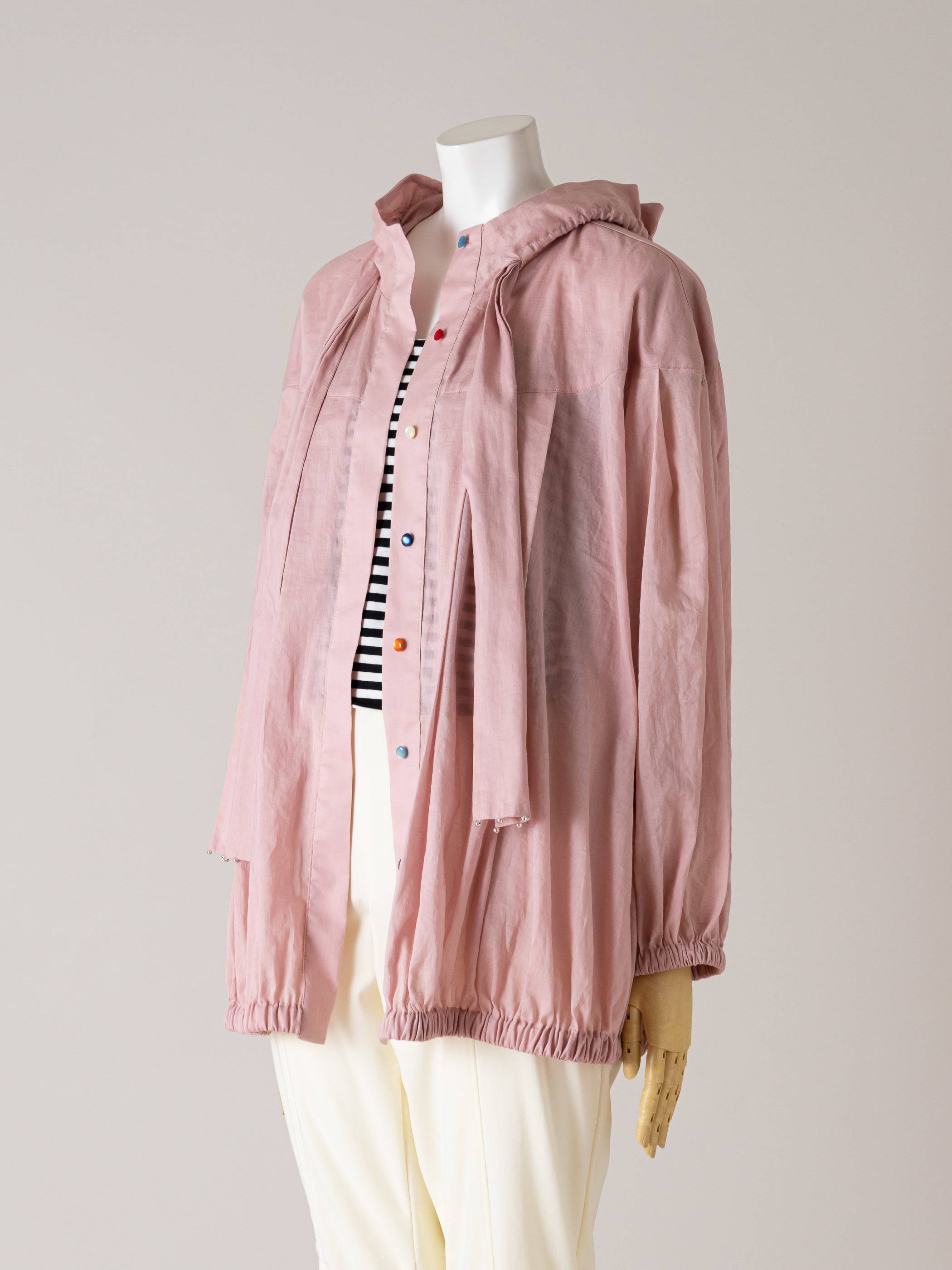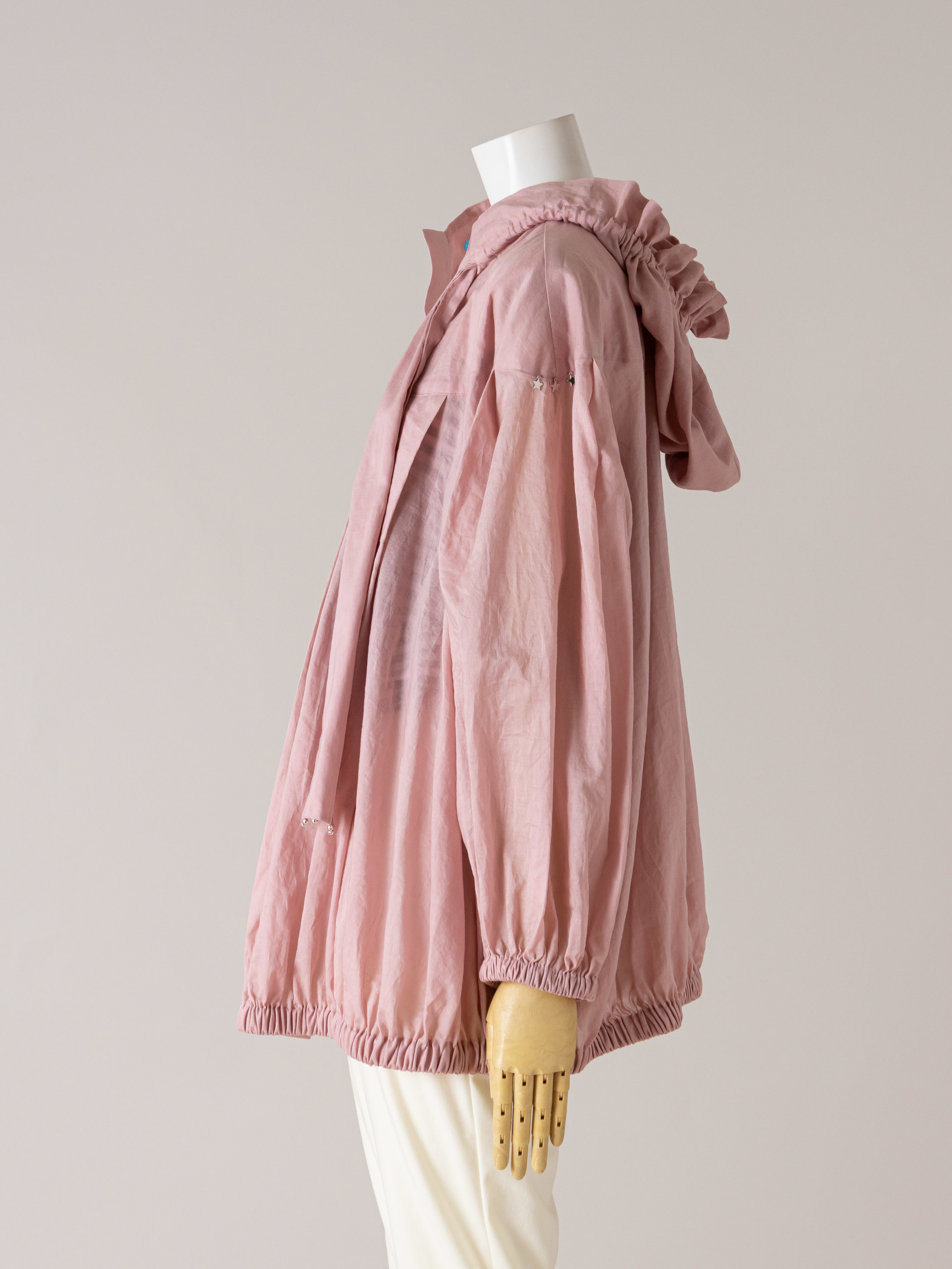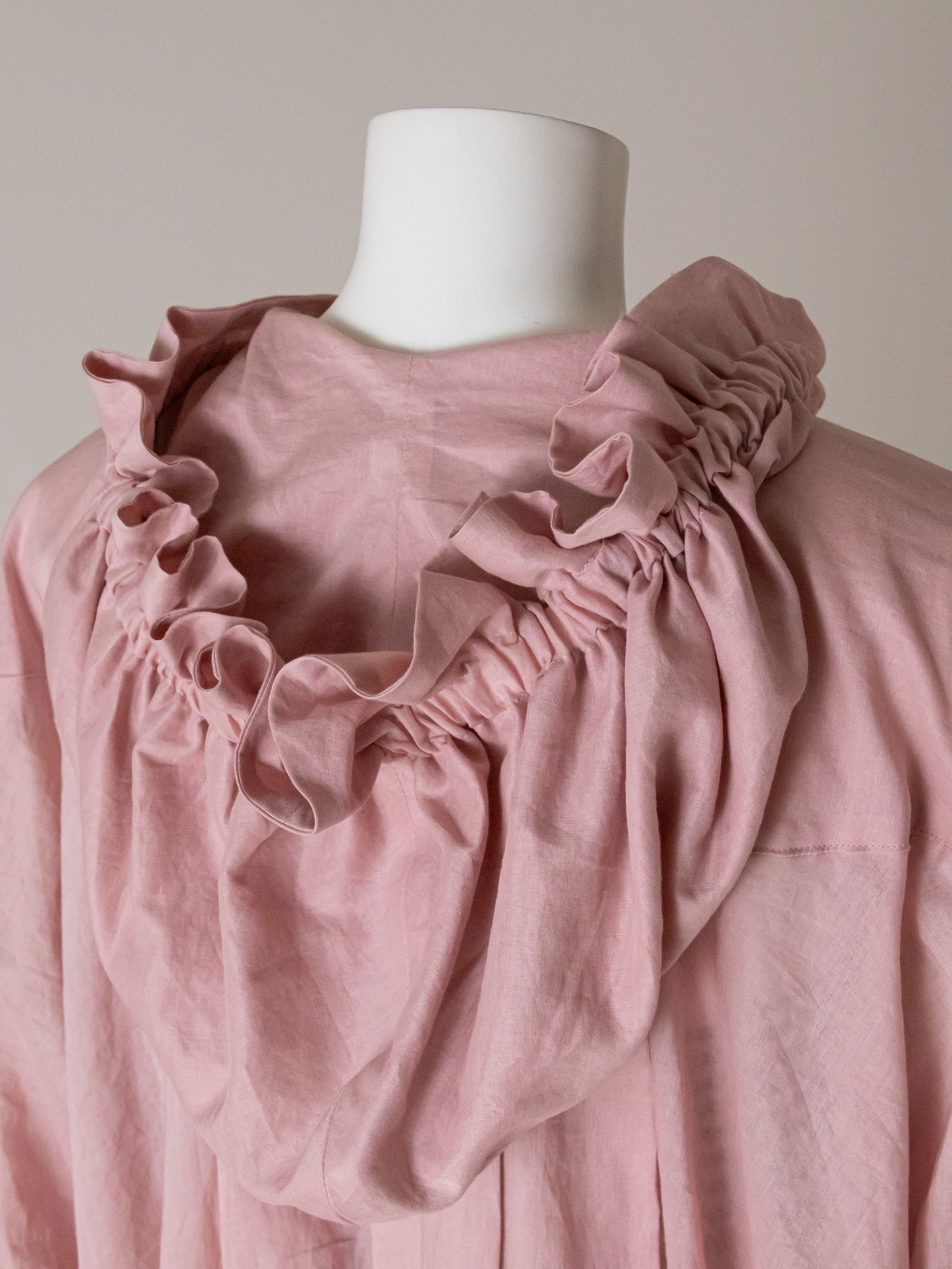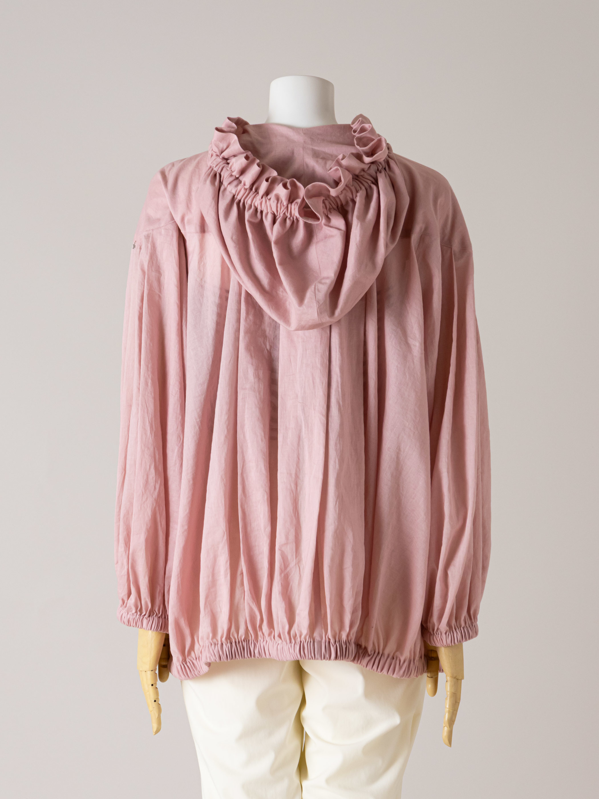 透け感のある軽いコットン素材を使用し、飾りフードはフリルの量を調整できます。