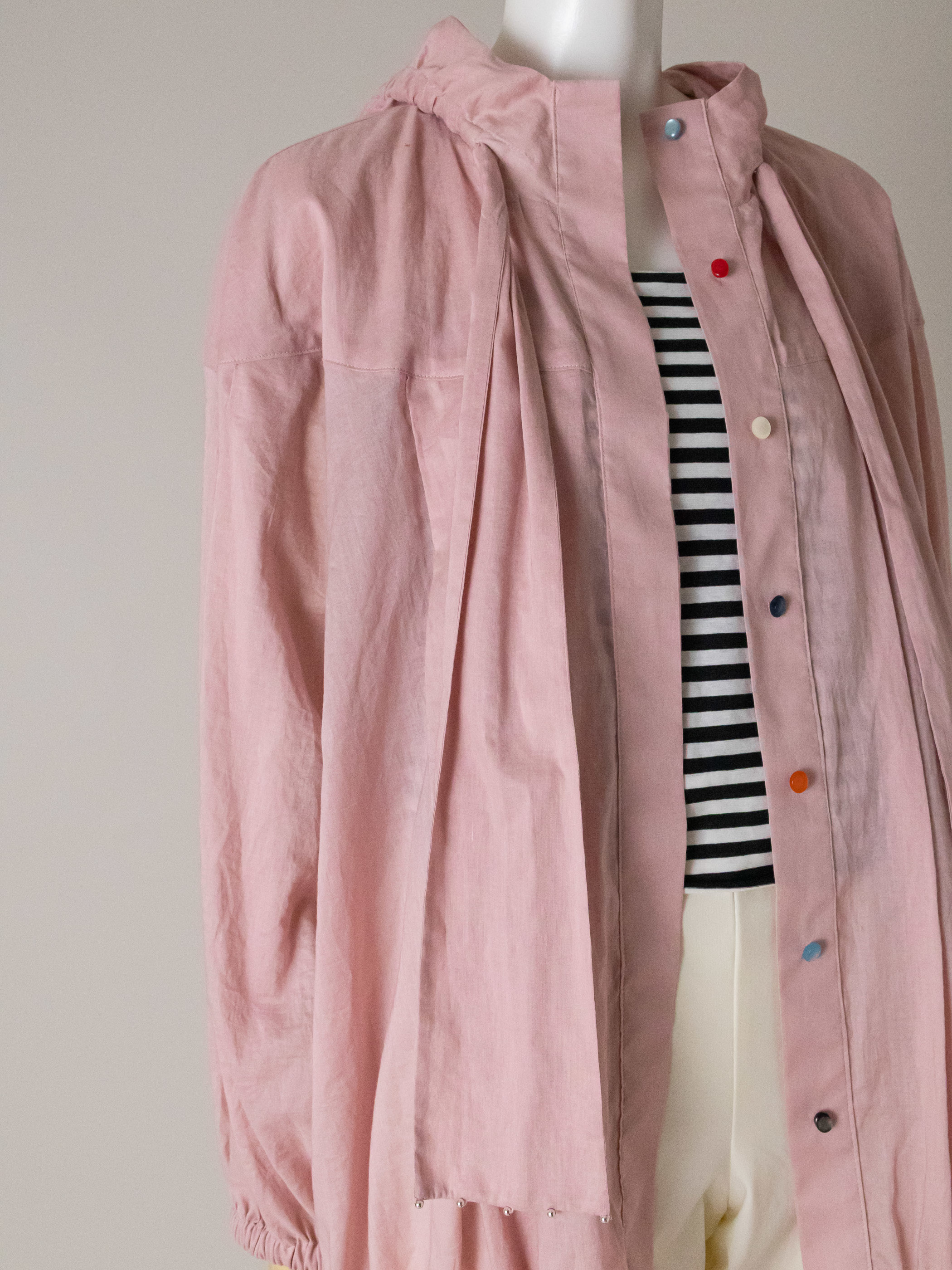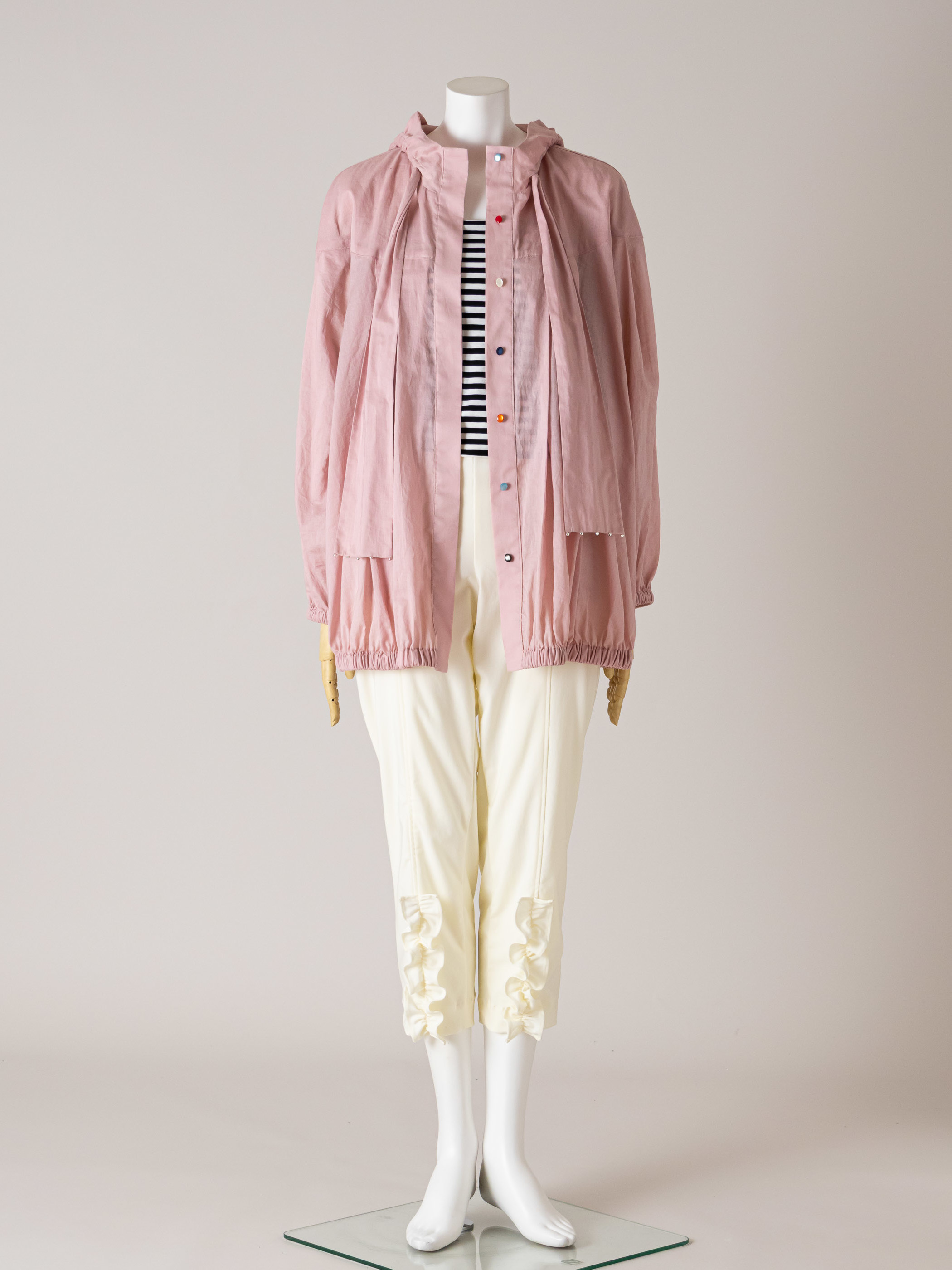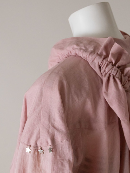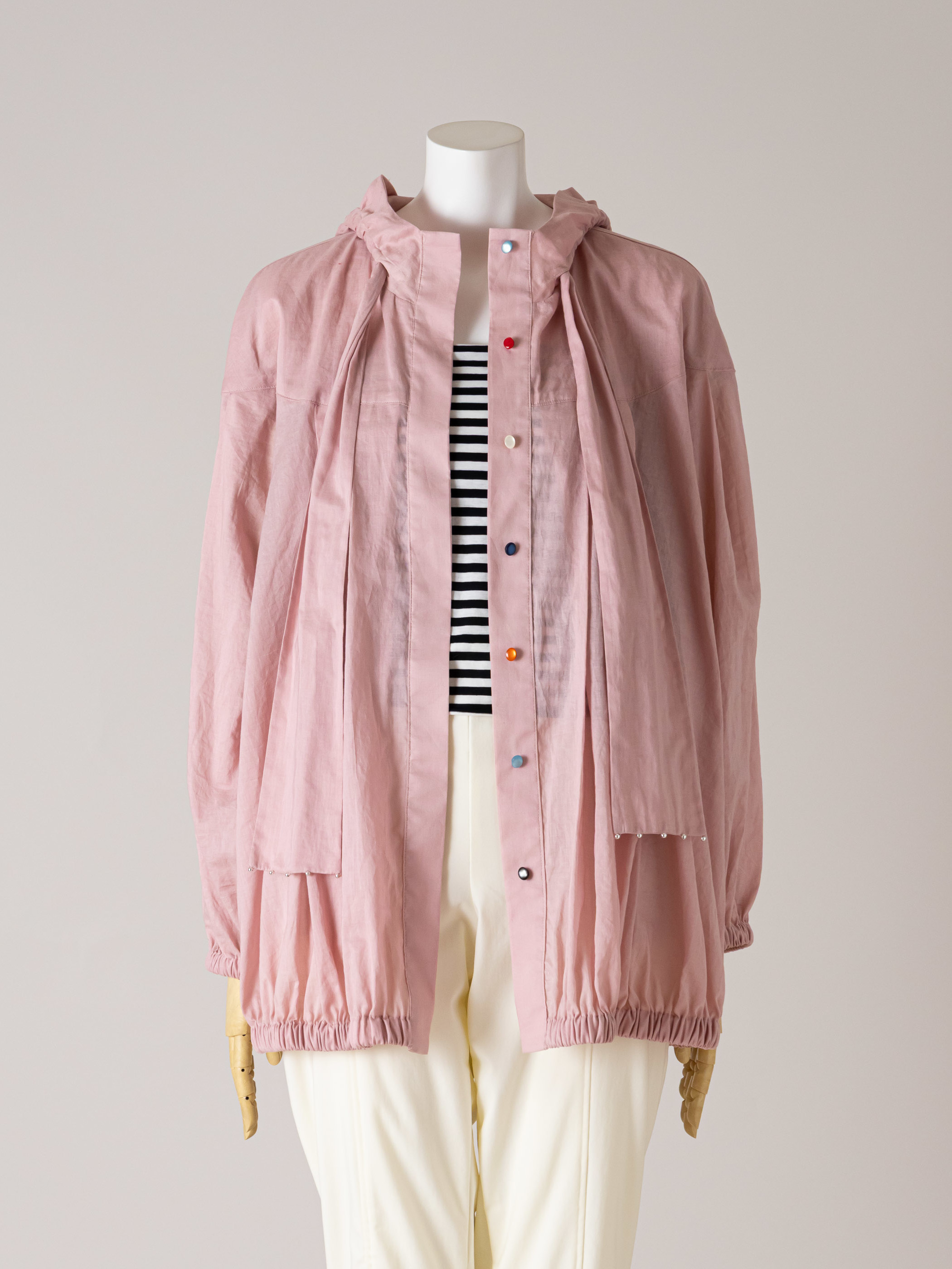 透け感のある軽いコットン素材を使用し、飾りフードはフリルの量を調整できます。