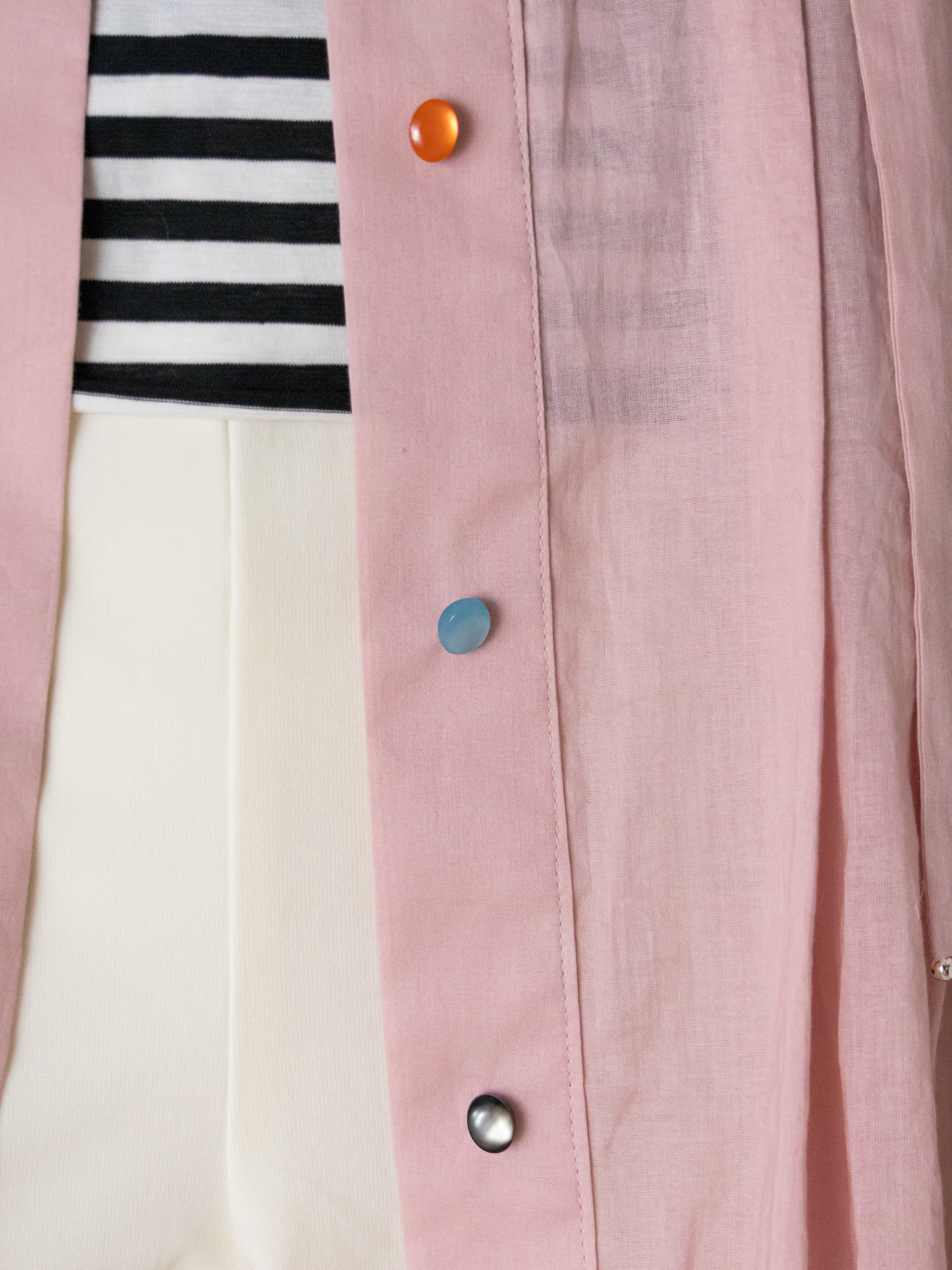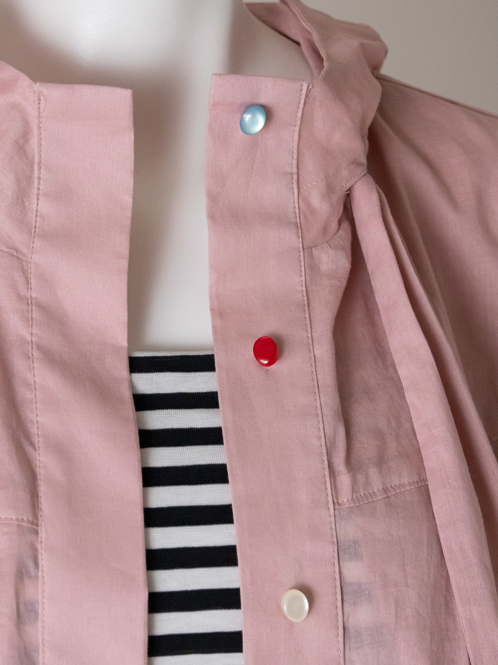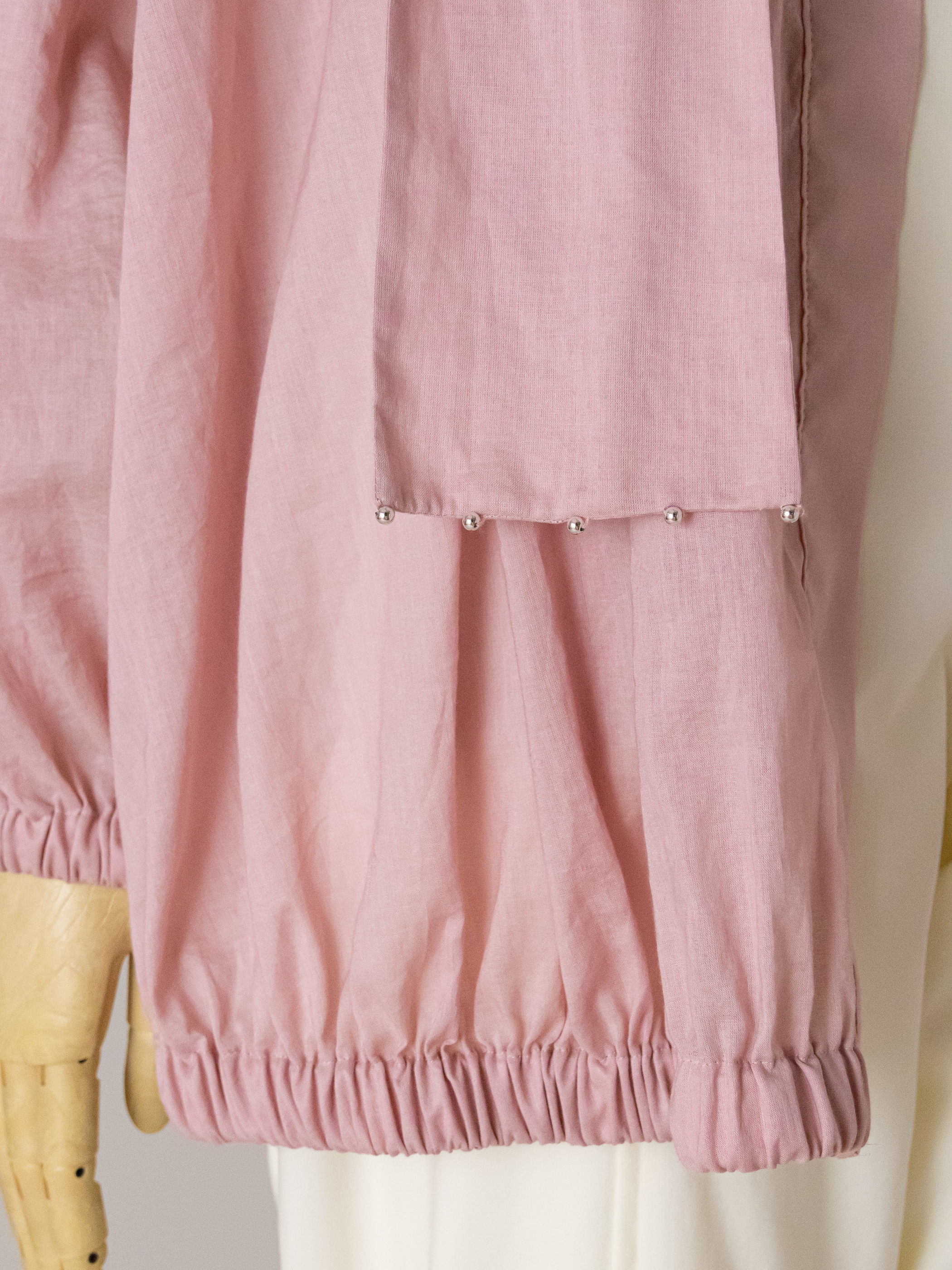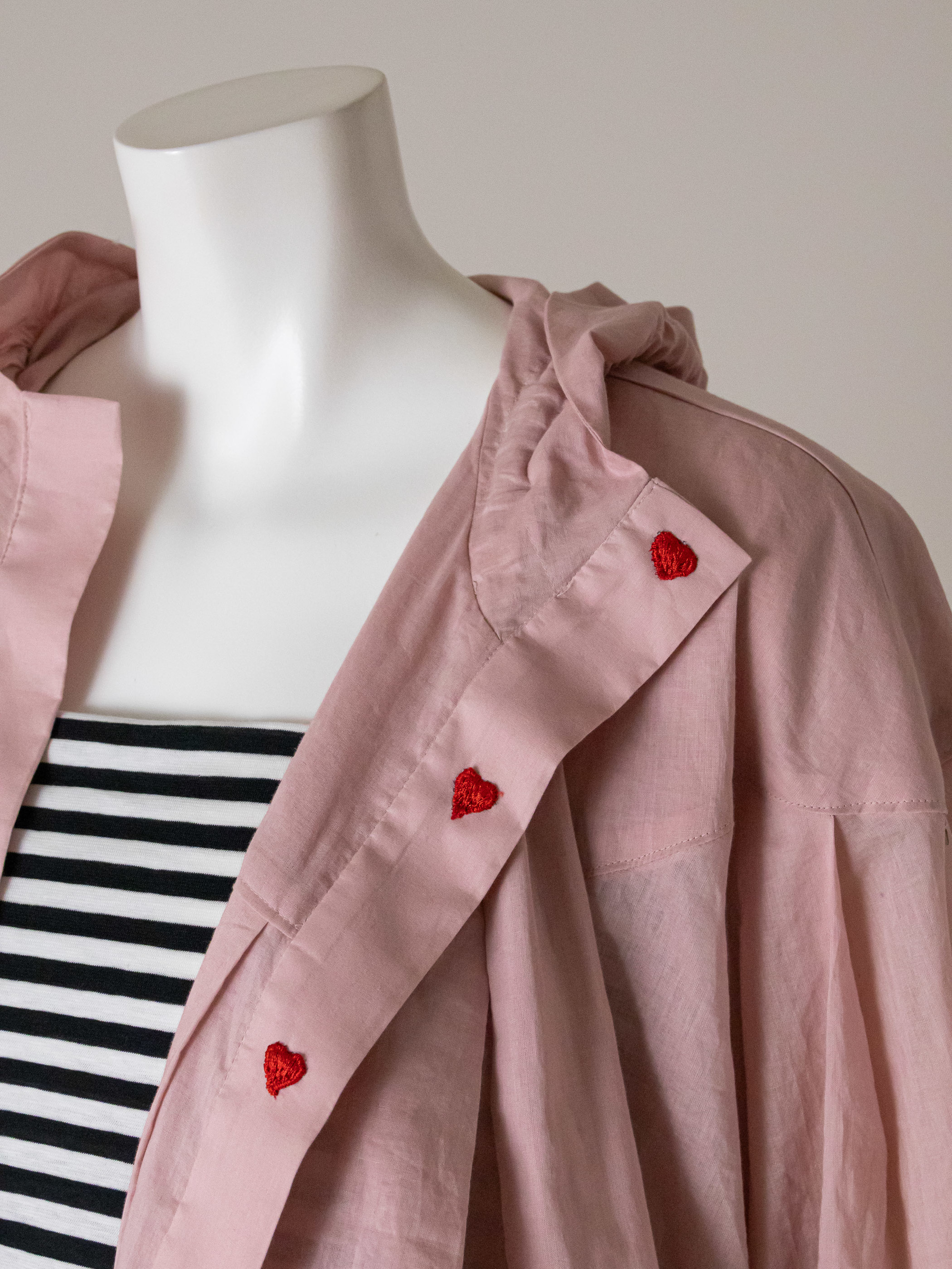 透け感のある軽いコットン素材を使用し、飾りフードはフリルの量を調整できます。