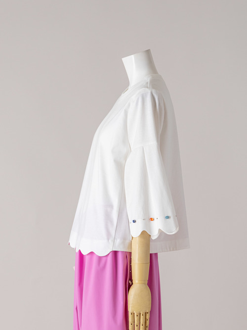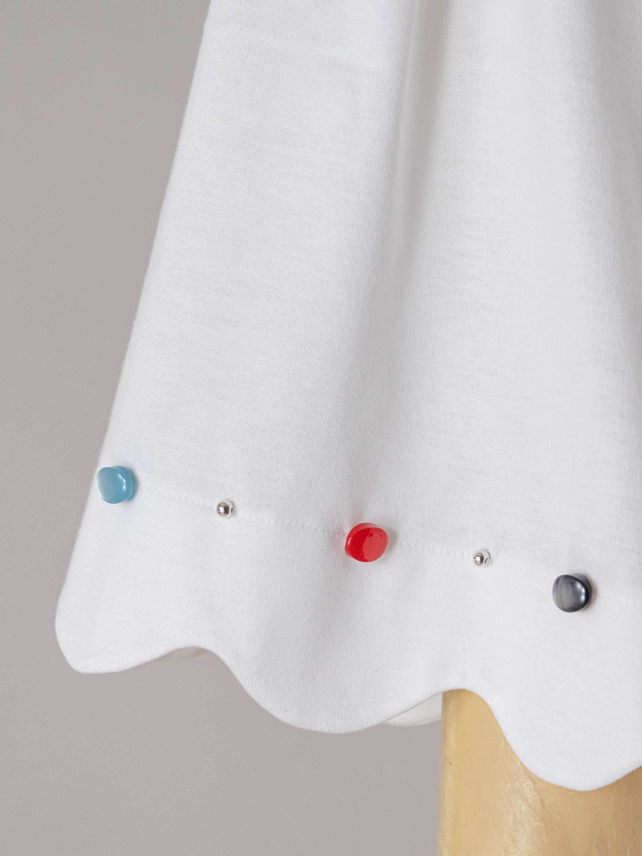 スカラでやわらかいイメージとお袖のカラフルなかざりボタンがポイントです。