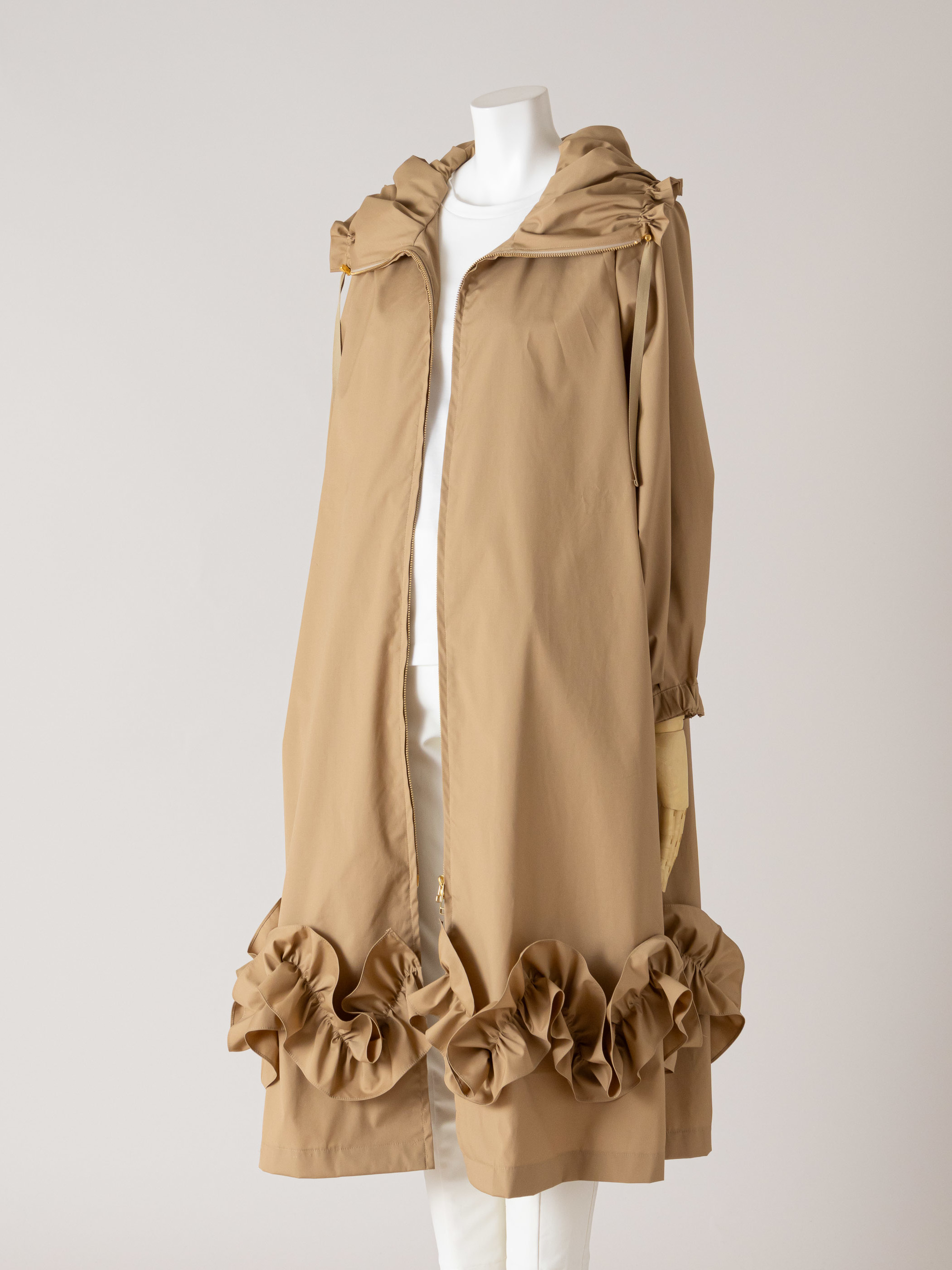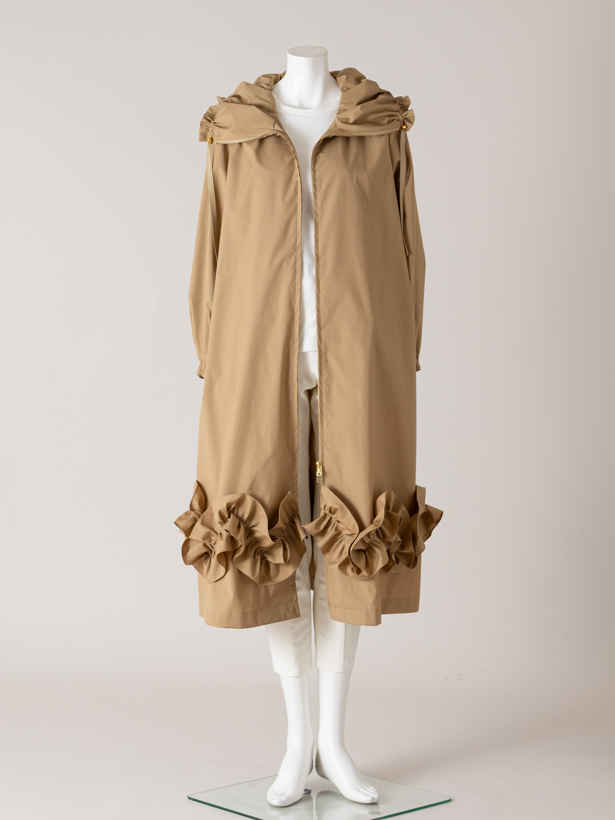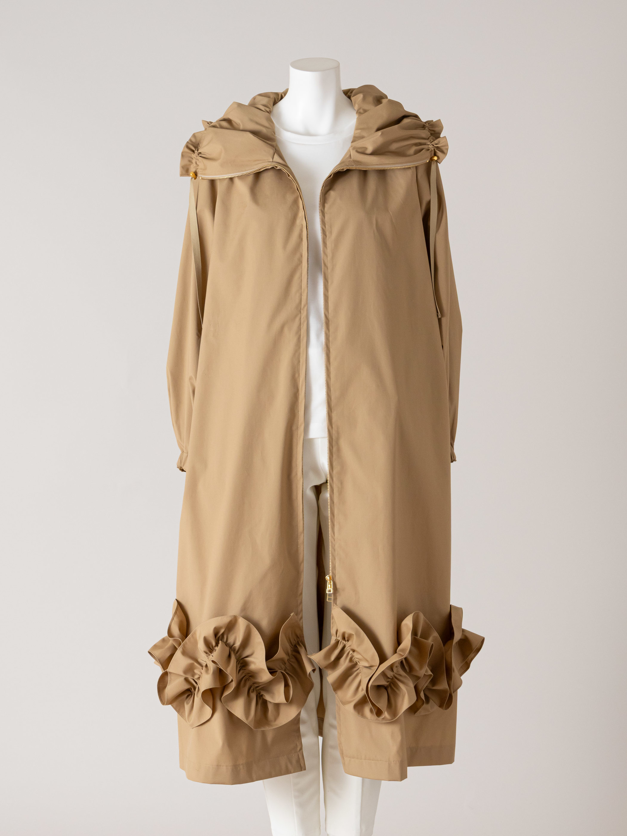 裾のフリルと衿がエレガントなラインコートです。