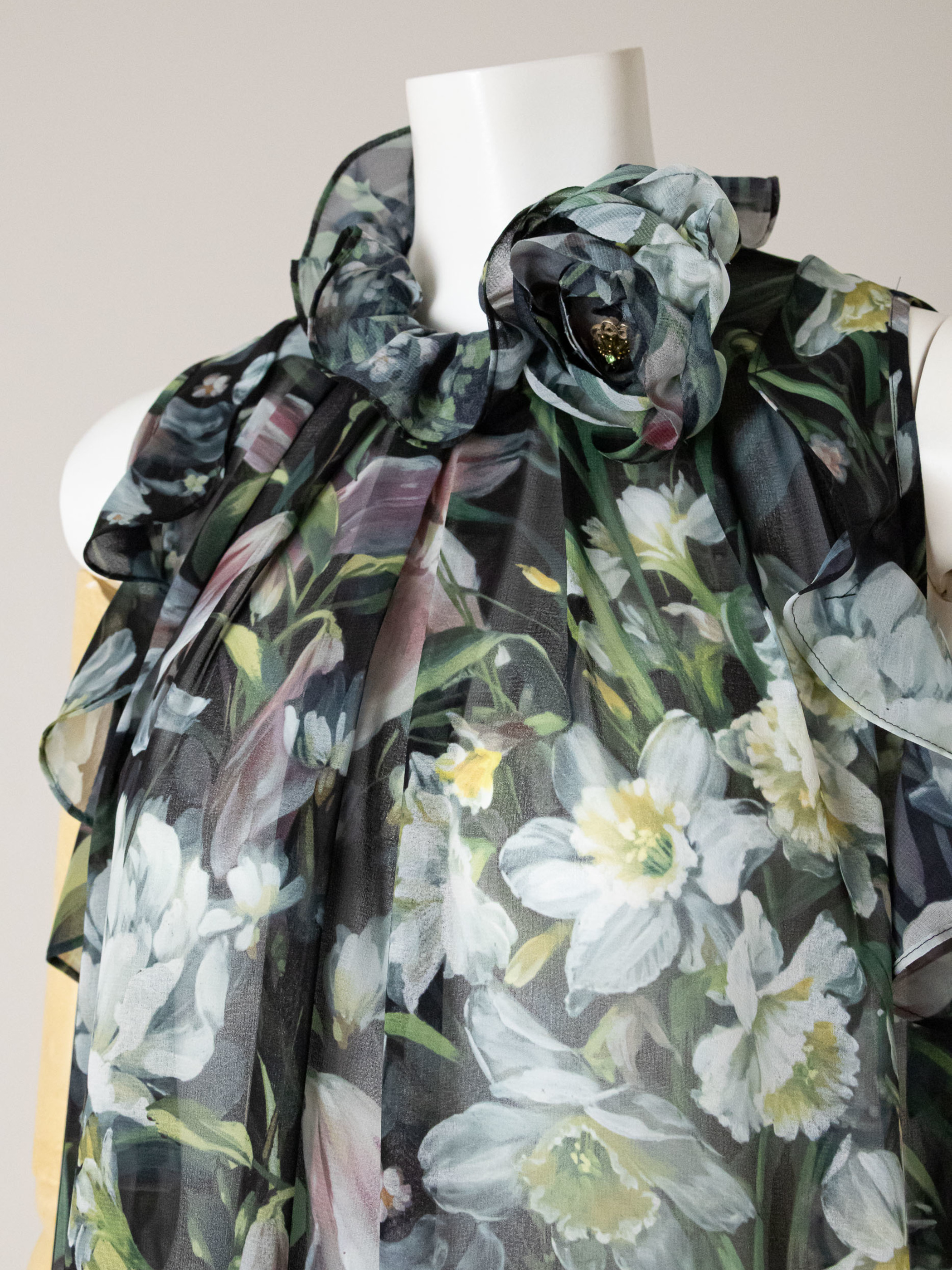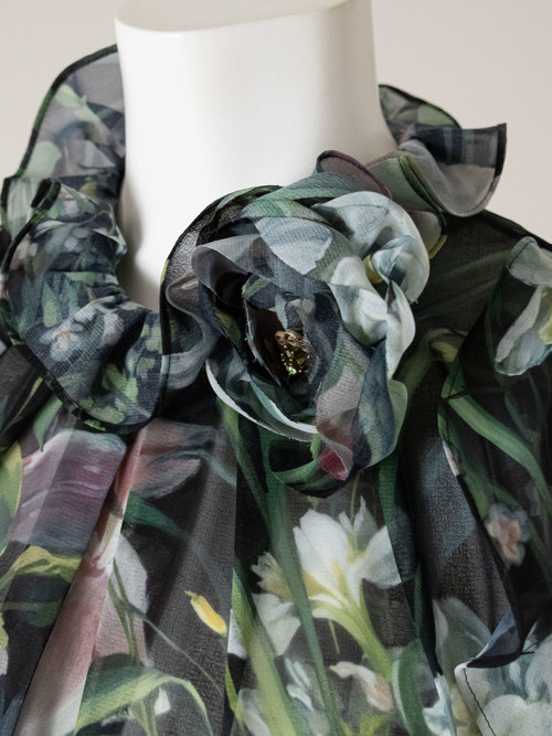 花びらを一枚ずつ重ねて作ったコサージュは衿元のフリルと一体化して華やかなイメージを出しています。