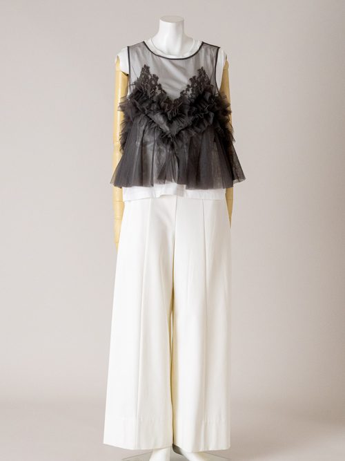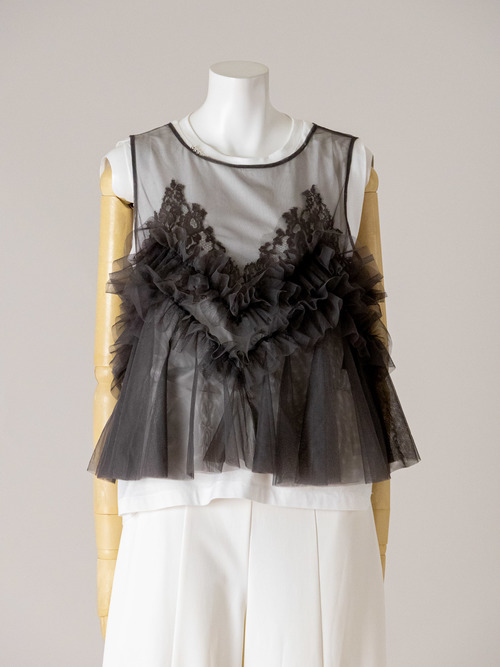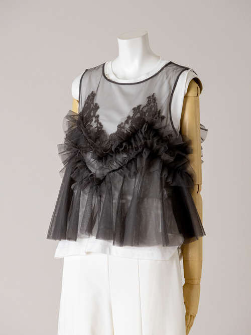 重ね着、シアー感、大人のフリルがキーワードのチュールキャミです。
