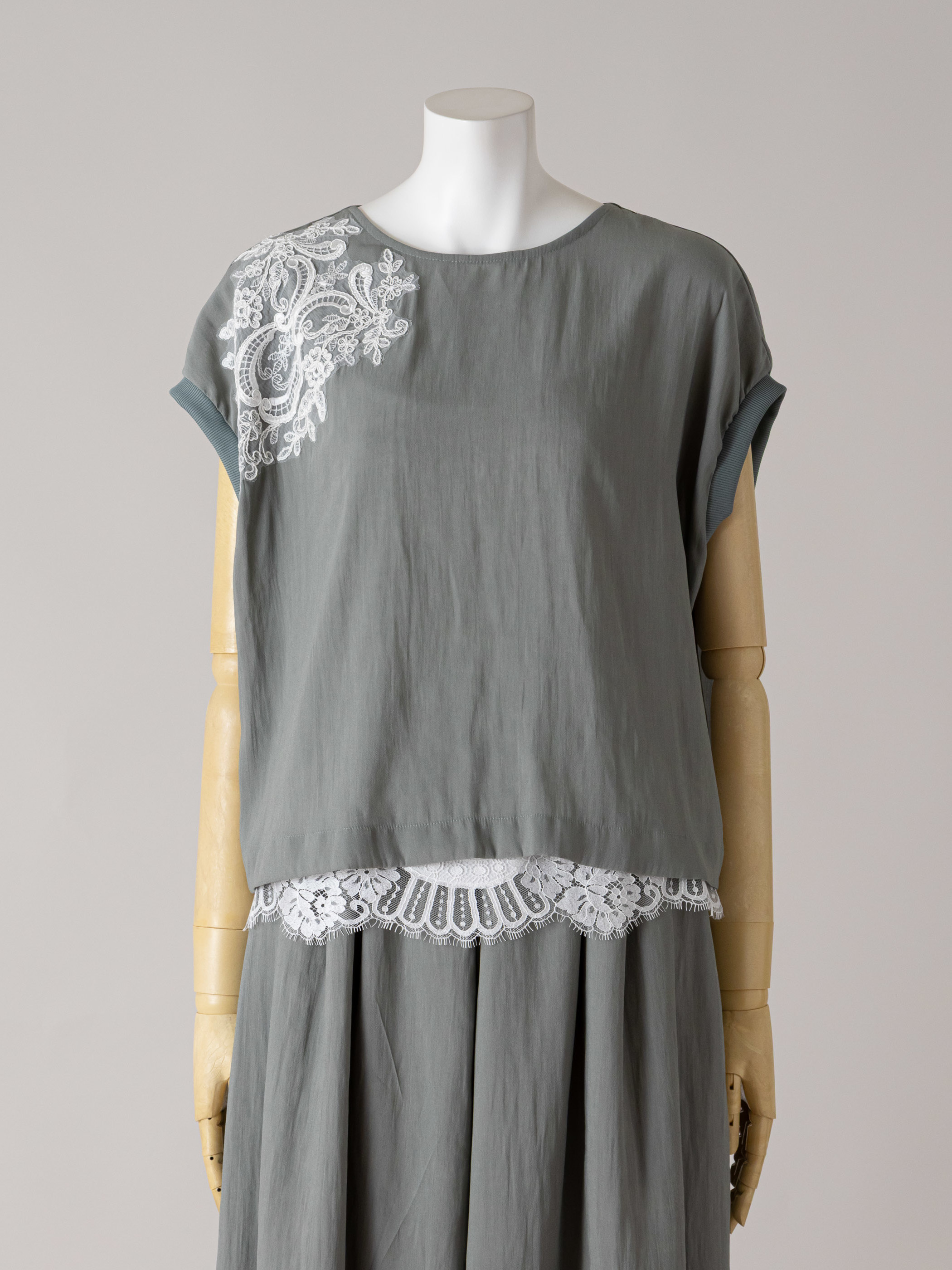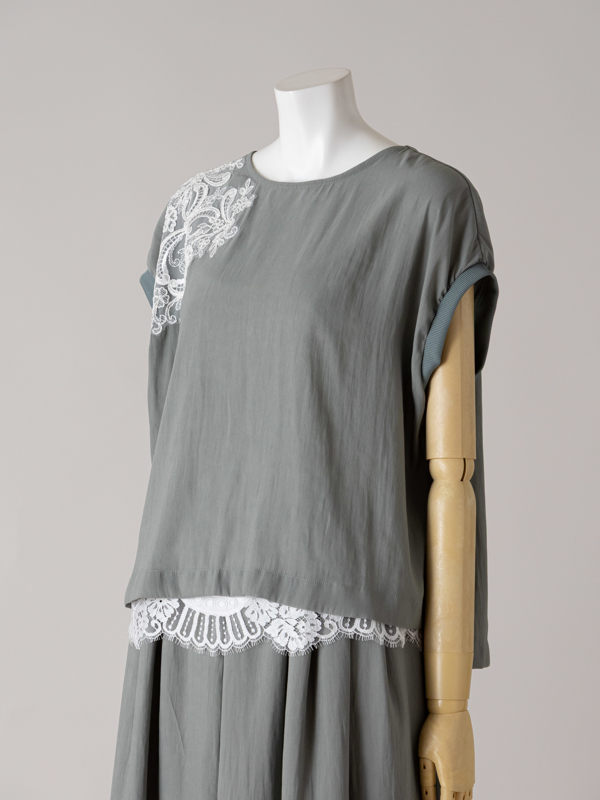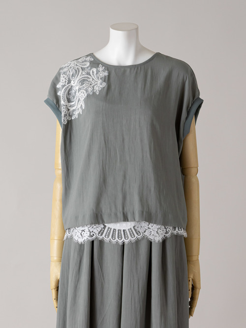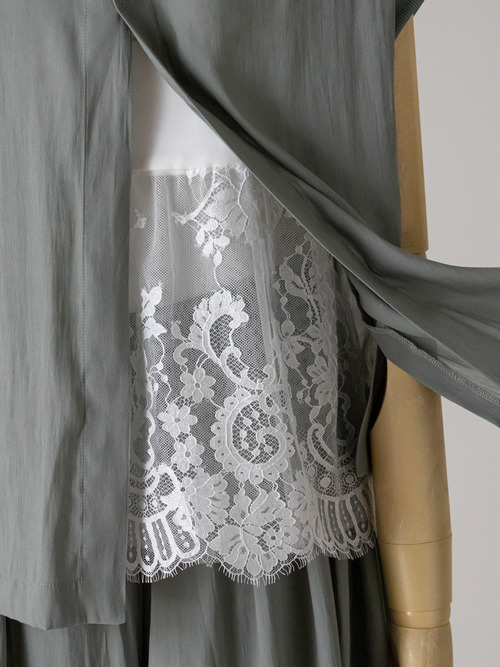 イージーケア素材が生み出すスレンダーなシルエットに、上質感のあるレース使いやディテールを加えています。