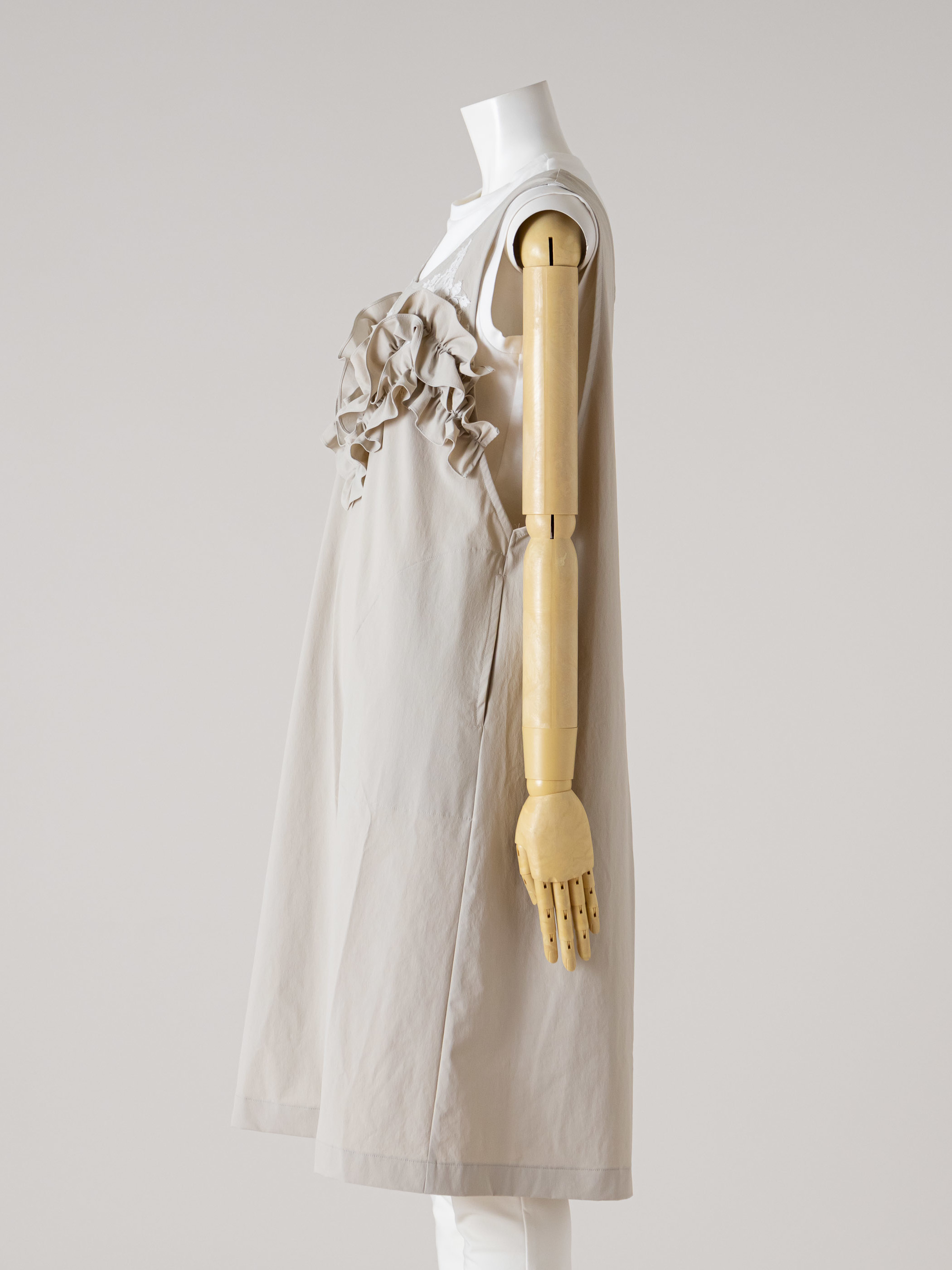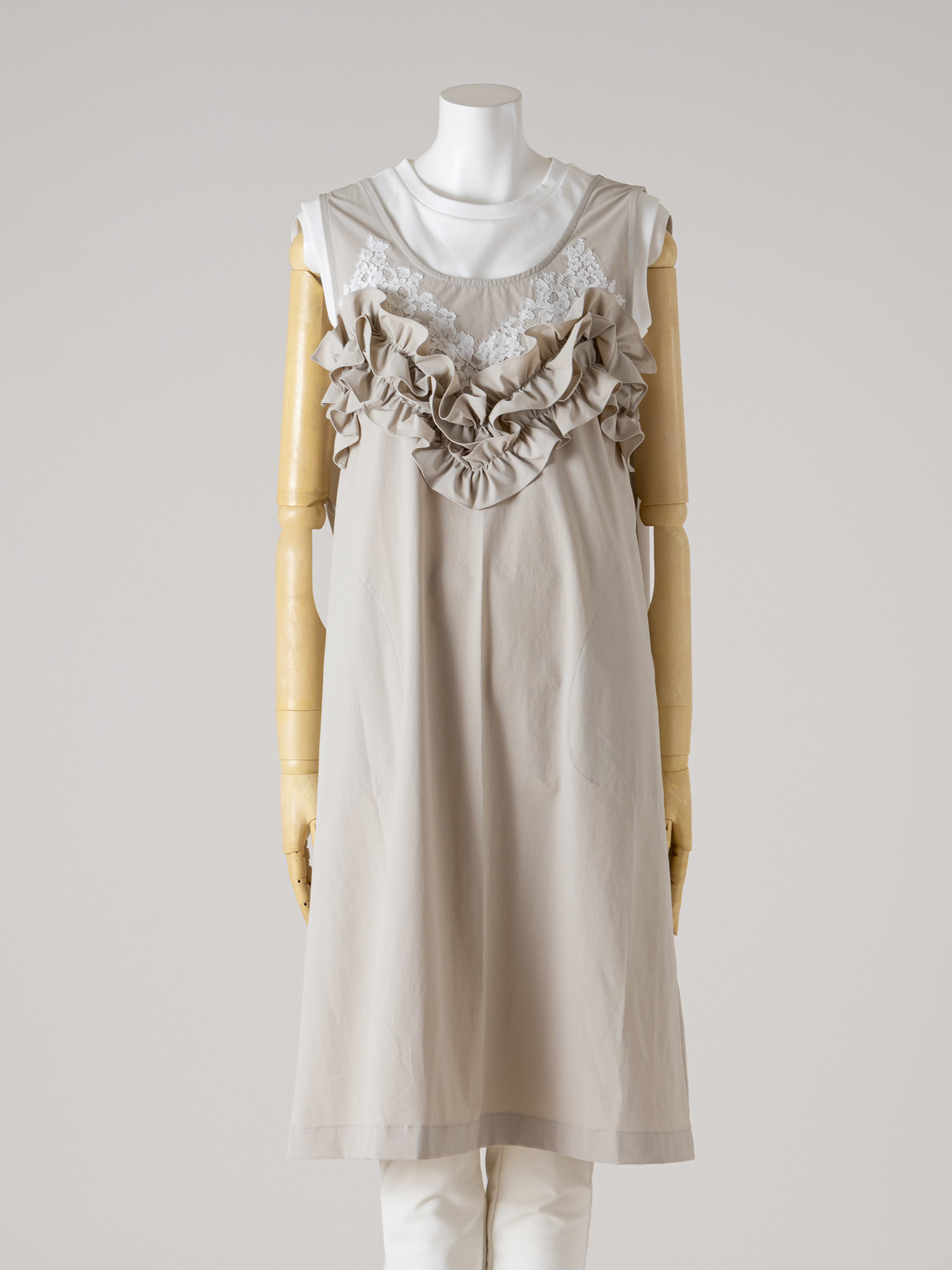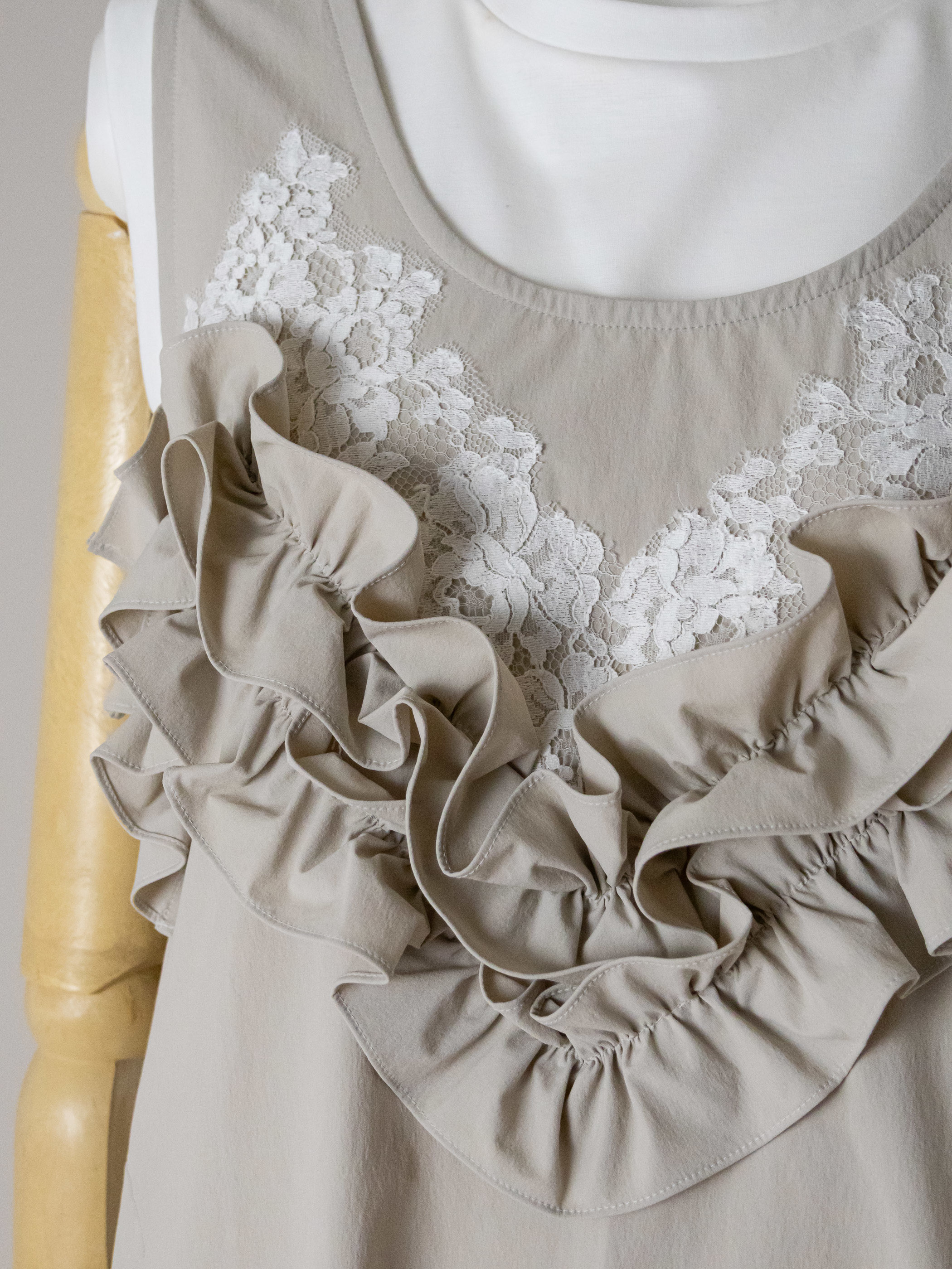 胸元のフリルとレースが華やかなエプロンに仕立て上げました。