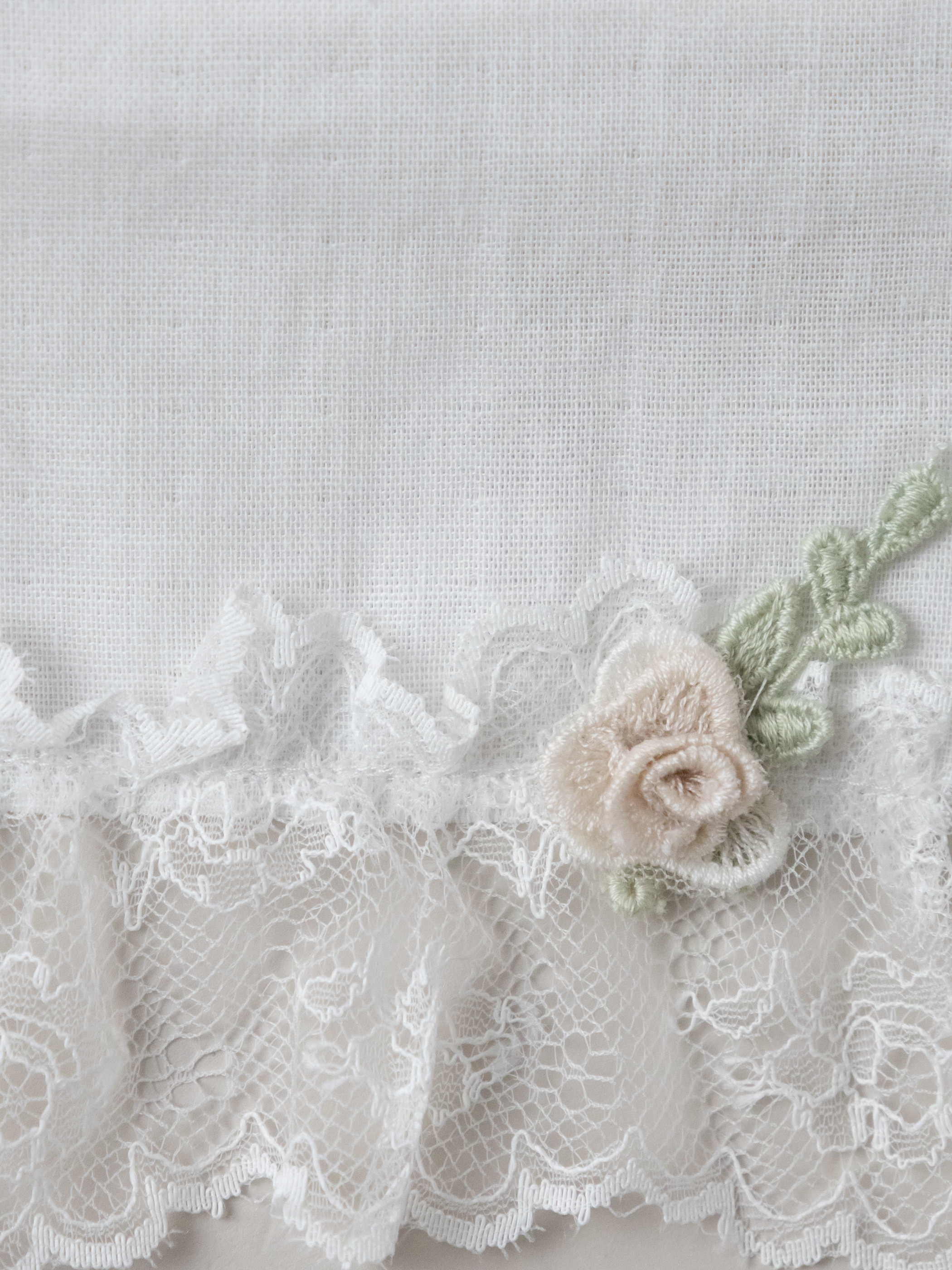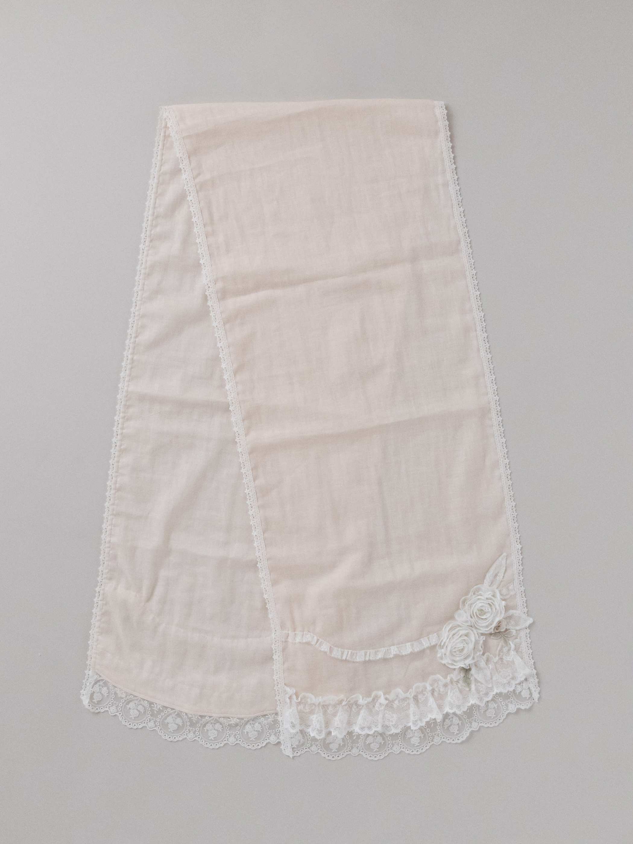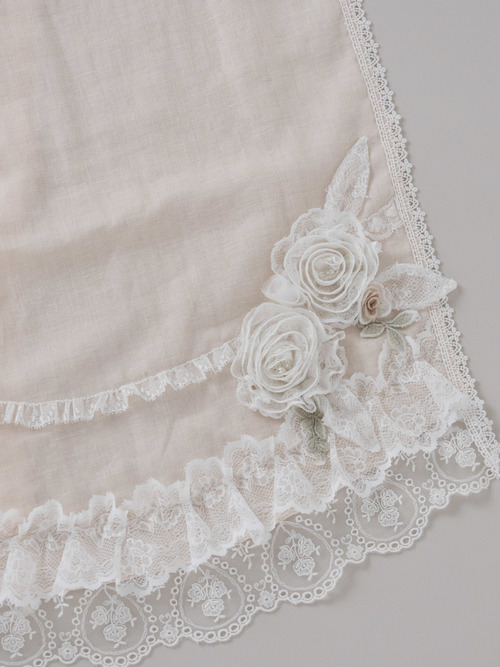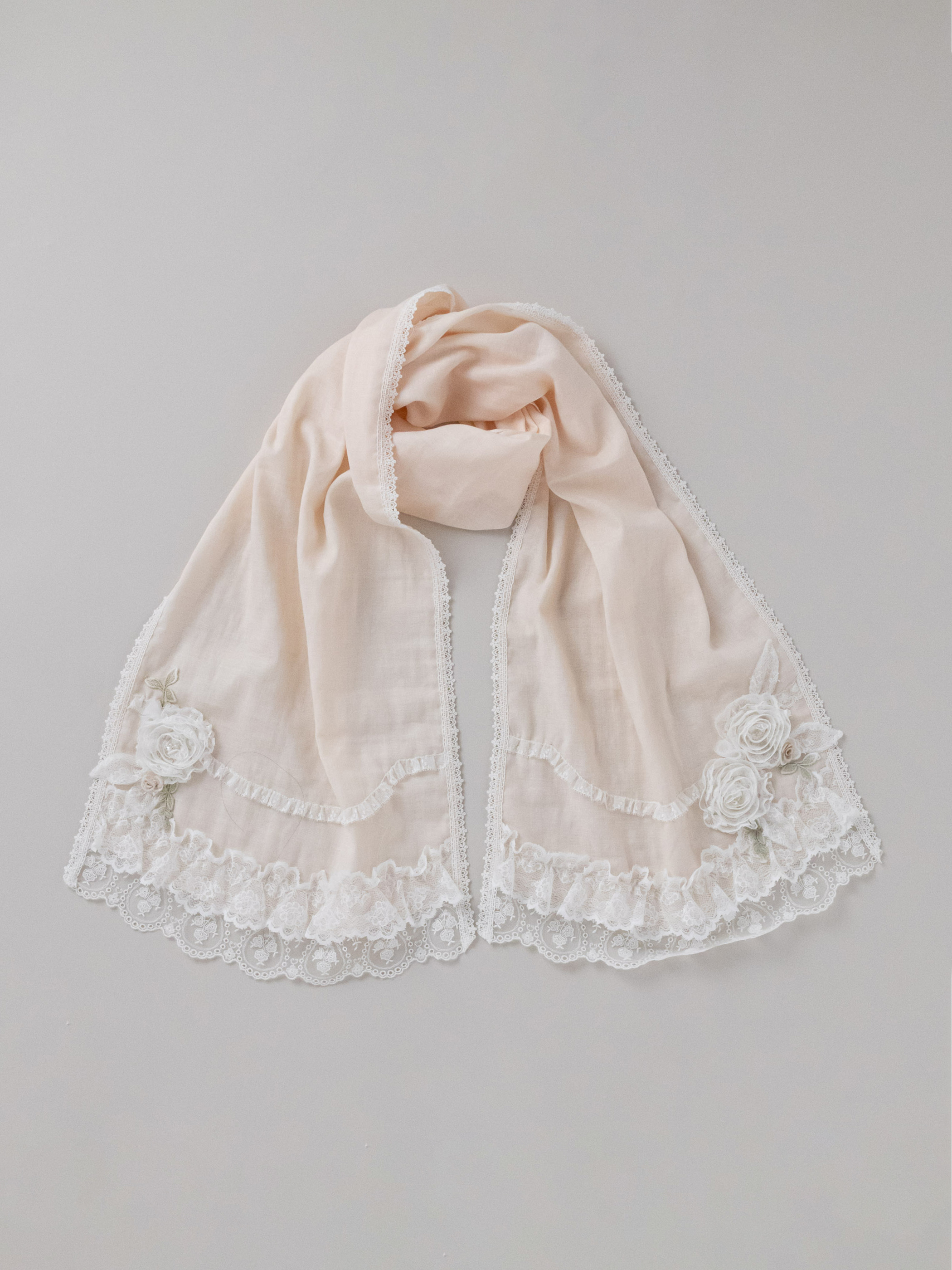 やわらかなガーゼ素材のストールに、立体のレースのバラ、染め花を添えました。