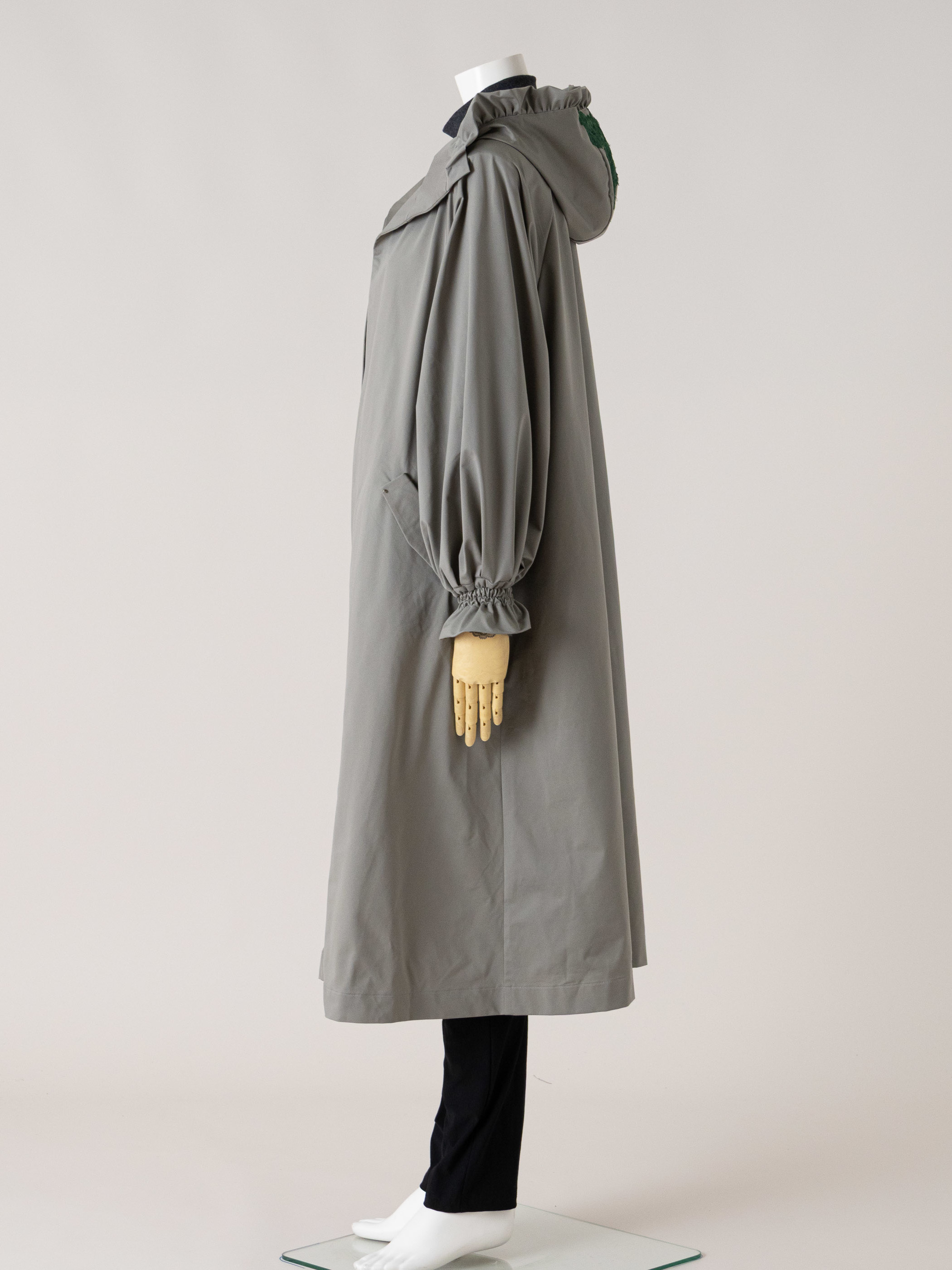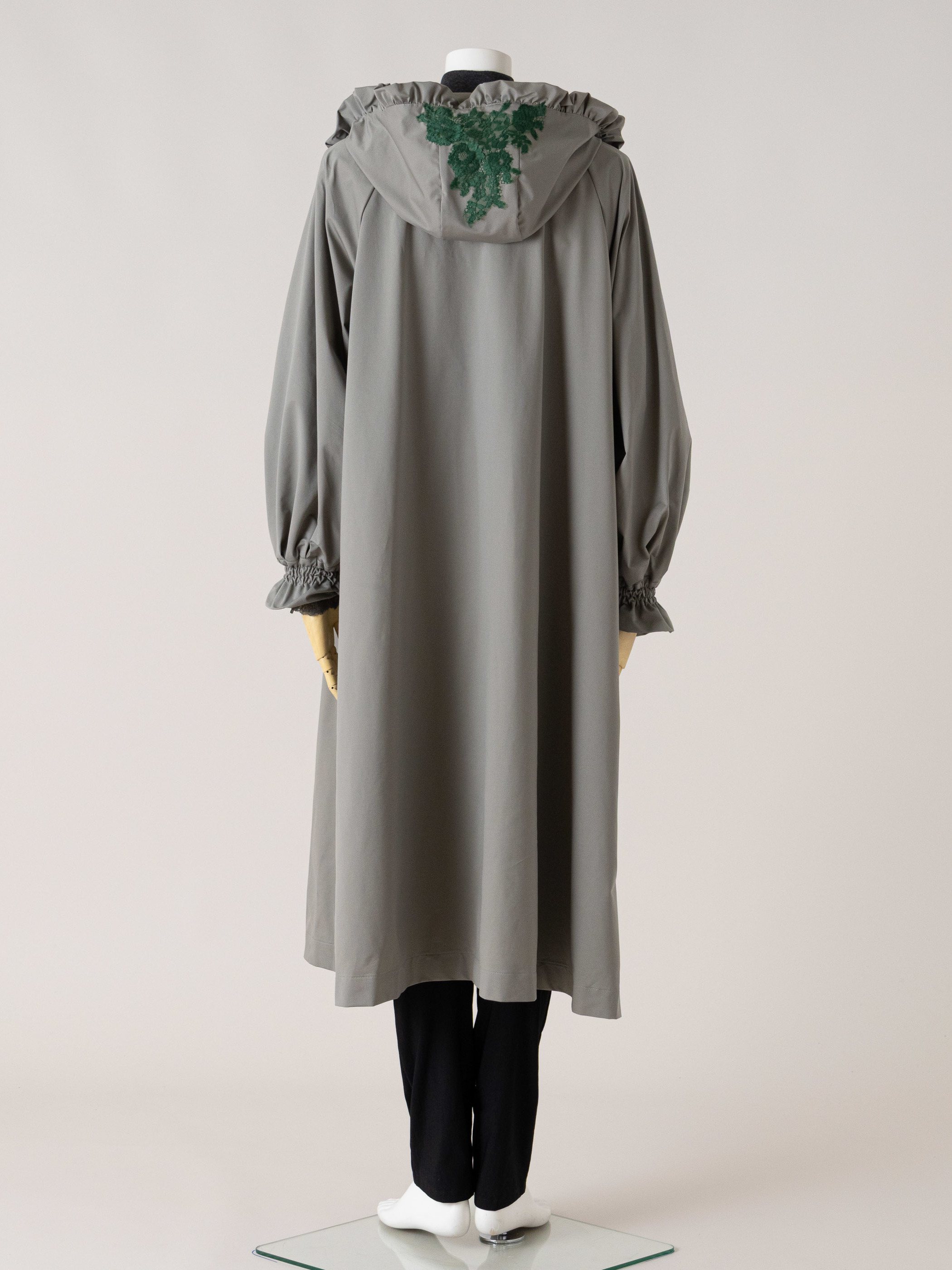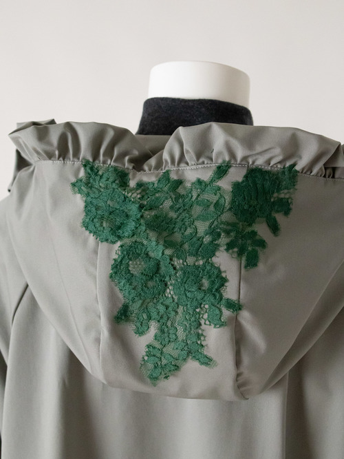 フードのフリルとレースでカジュアルになりすぎないデザインに仕上げています。
