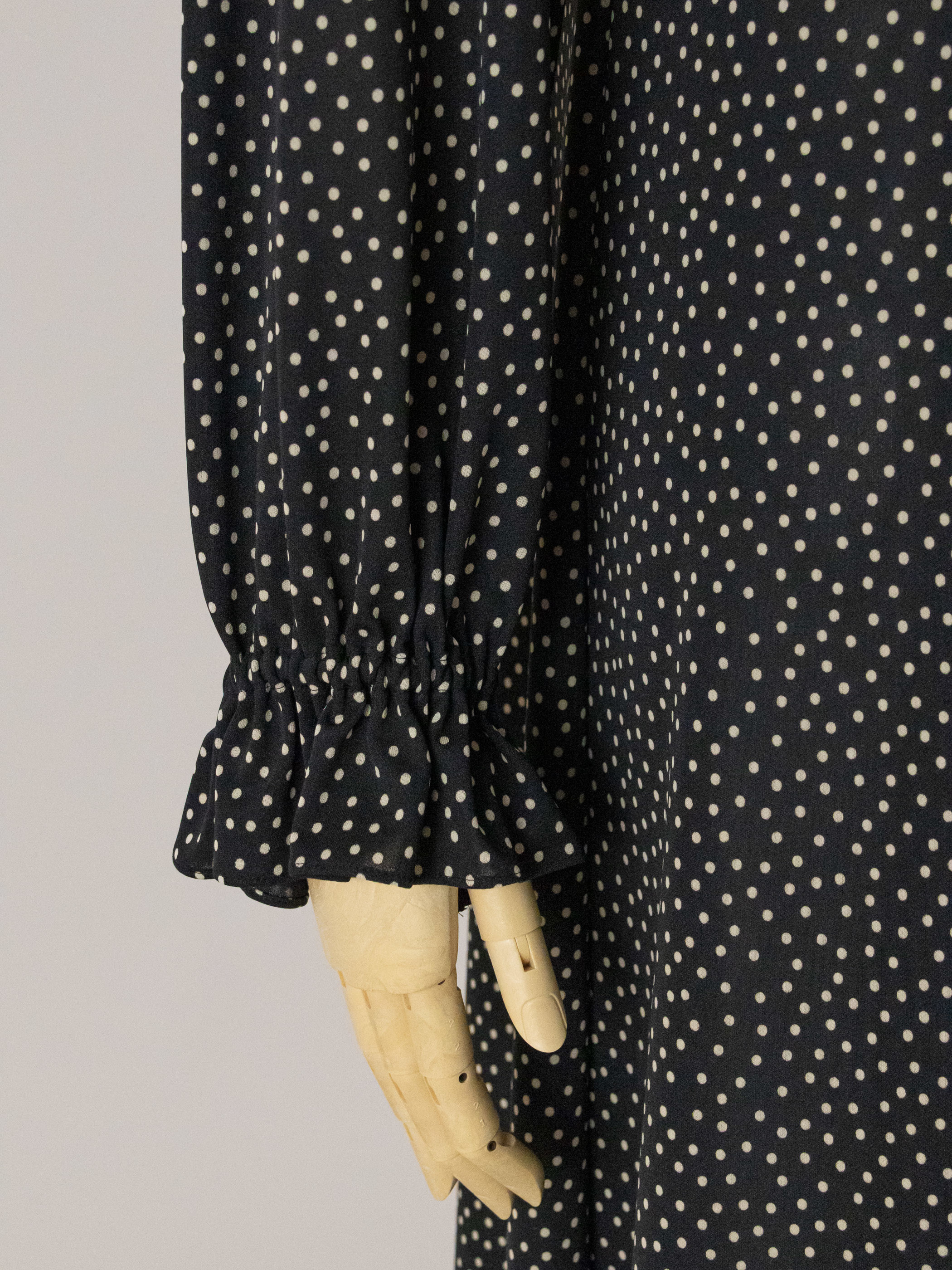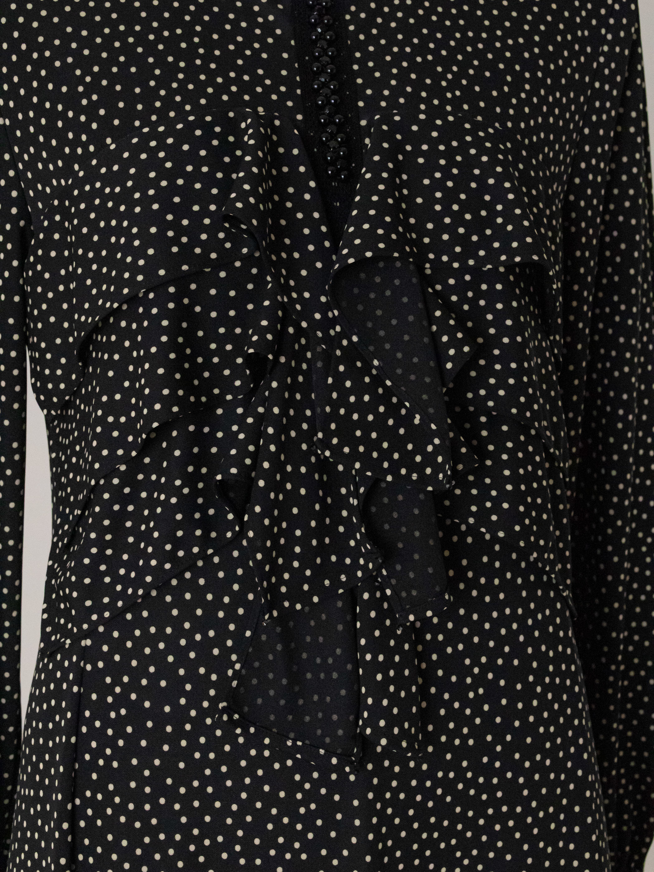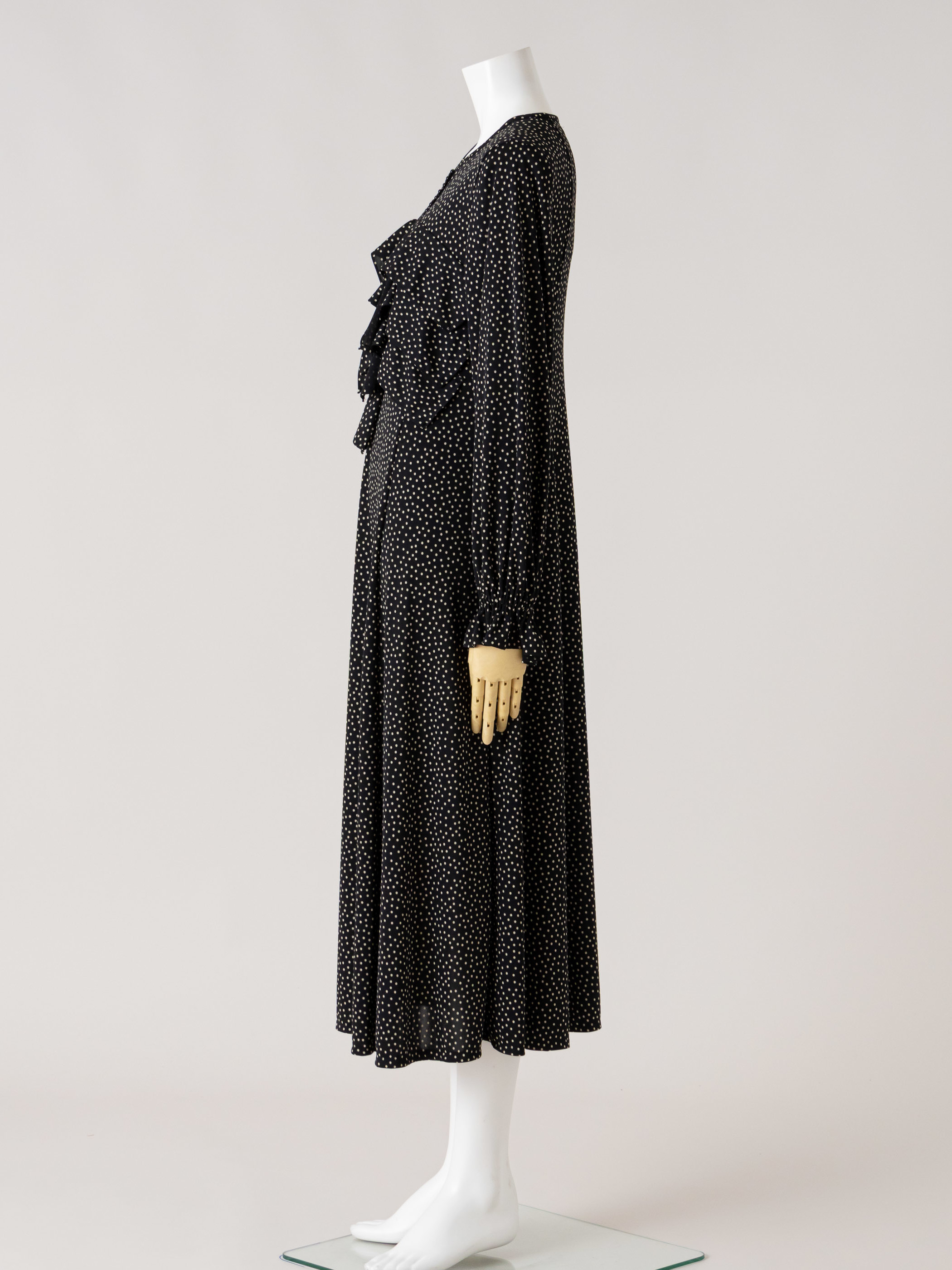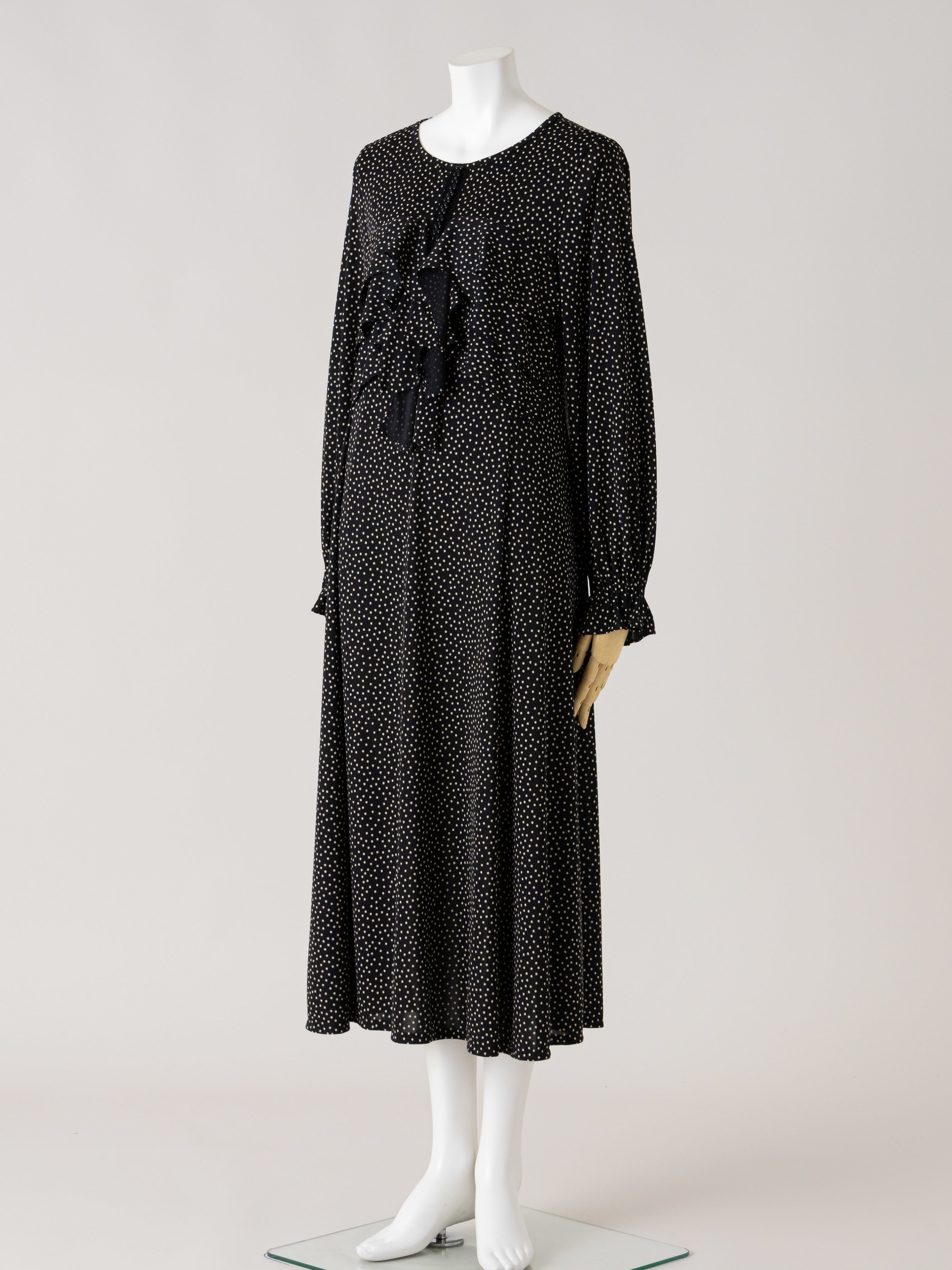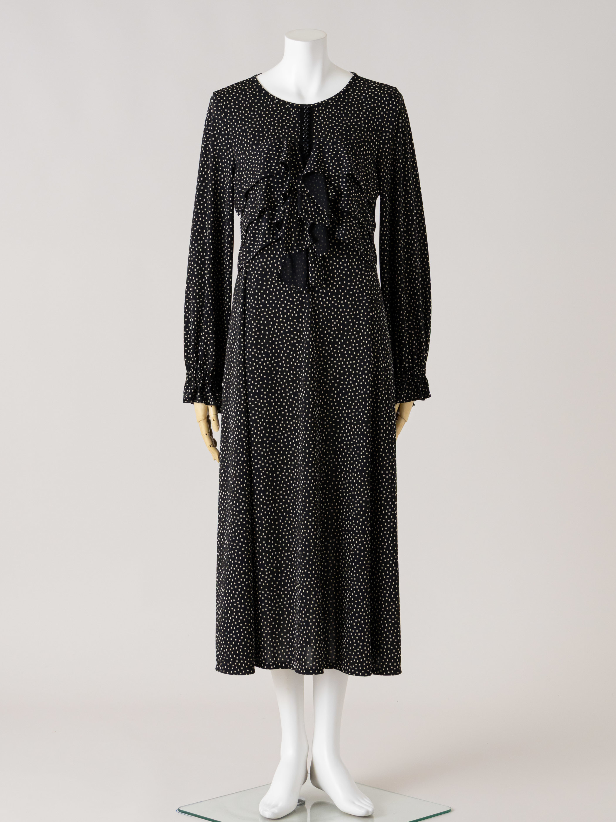 胸元に垂れたリボンが動くたびに静かに揺れて、流動的なシルエットでフェミニンさを演出した水玉ニットのワンピースです。
